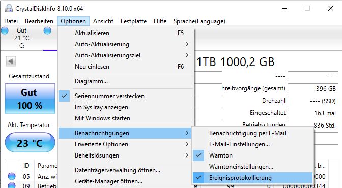 Ich habe Crystal Disk Info so eingestellt, dass Änderungen in der Windows Ereignisanzeige eingetragen werden. Das ist einfacher, als nach einem Warnton in den Werten zu suchen und mit älteren Screenshots zu vergleichen. Zum Beispiel wird dann eingetragen, wenn die Verschleißregulierung sich um einen Prozent verschlechtert hat oder die eingestellte Temperaturgrenze überschritten ist.