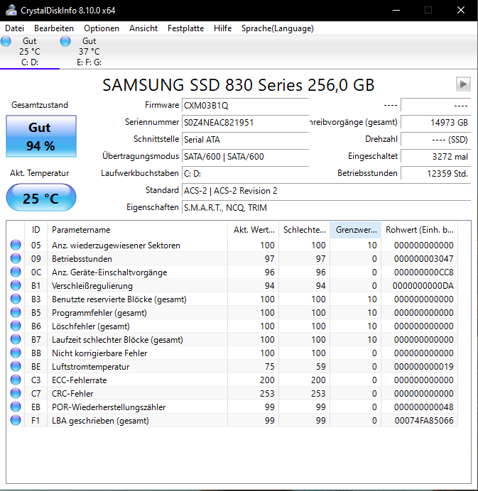 Das ist wenig für eine über 8 Jahre alte SSD.elfmarkfuchzich schrieb:Aktuell 14,62 TB mit 12359Stunden Betriebszeit.
