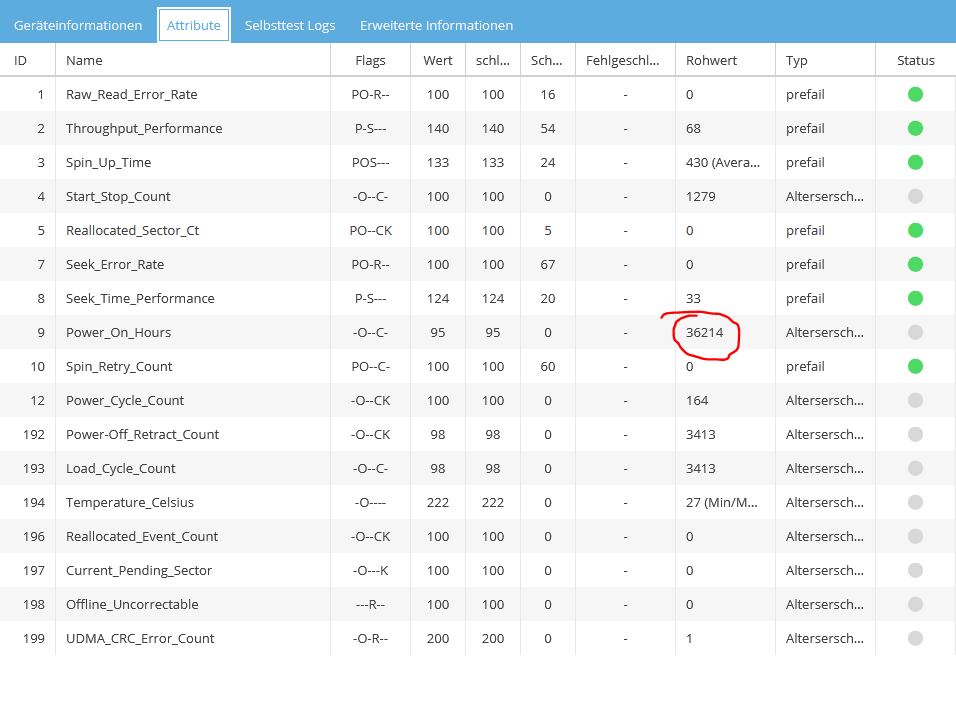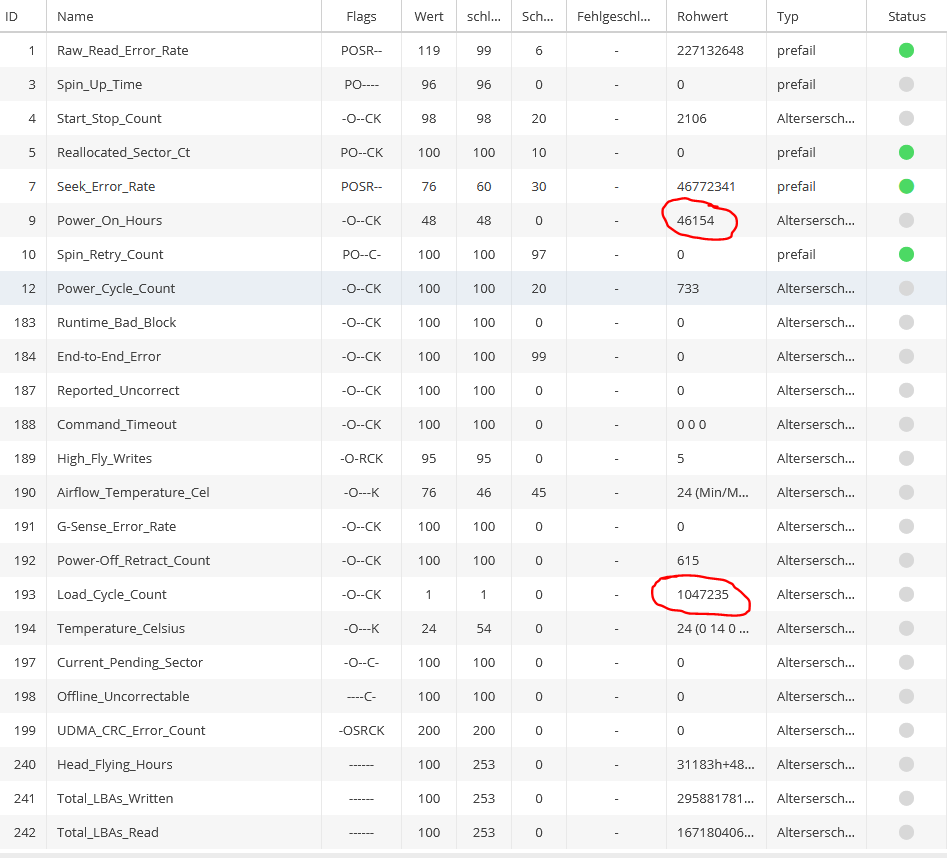 Ich hab hier seit 2015 oder so (könnte länger sein) ne 2TB WD Blue im 24/7-Betrieb, auch noch eine mit diesem Spindown-Bug.azunutz schrieb:Meine Frage ist ob jemand Erfahrungen damit hat wie lange NAS Festplatten im 24/7 Betrieb leben?