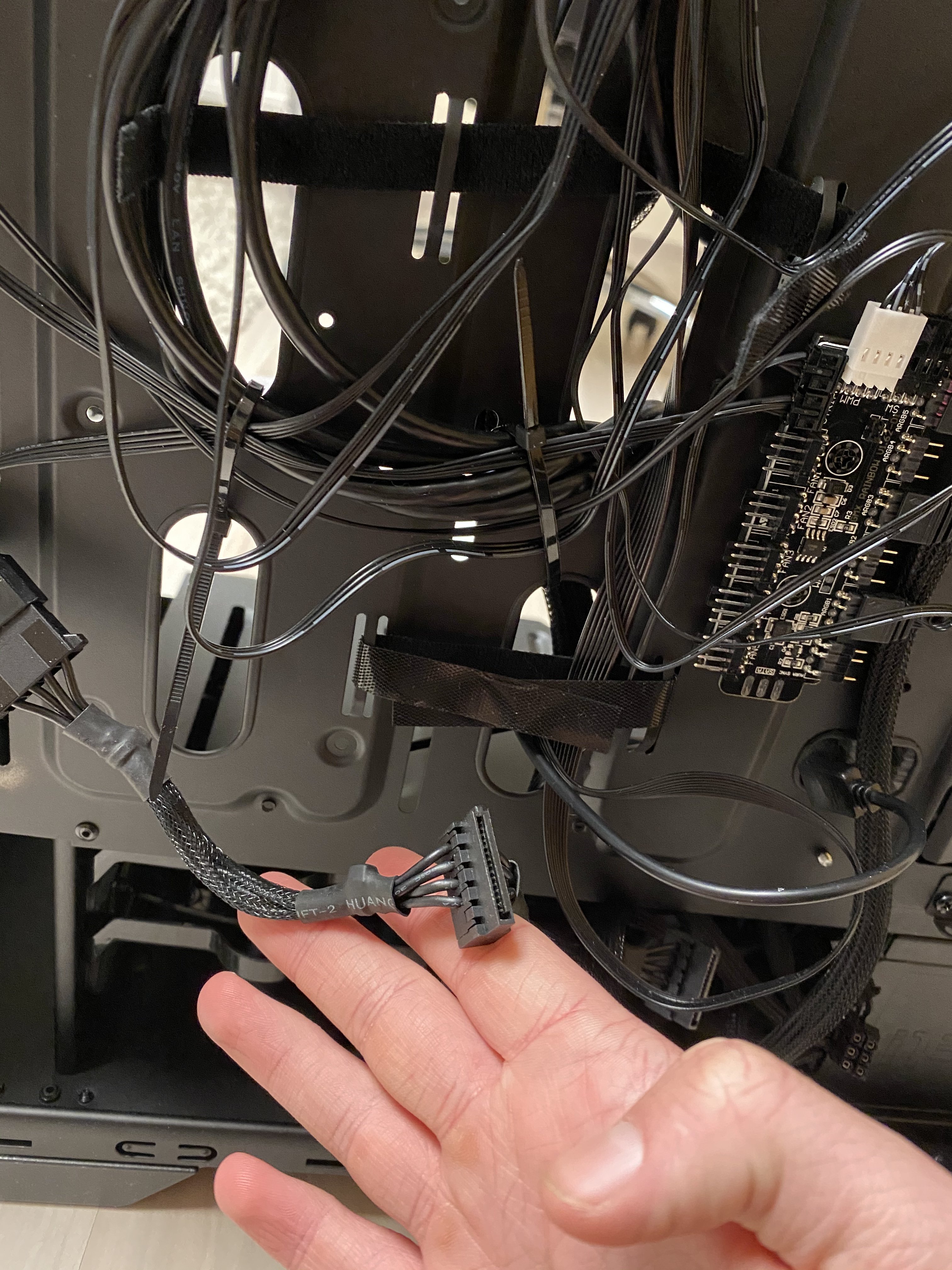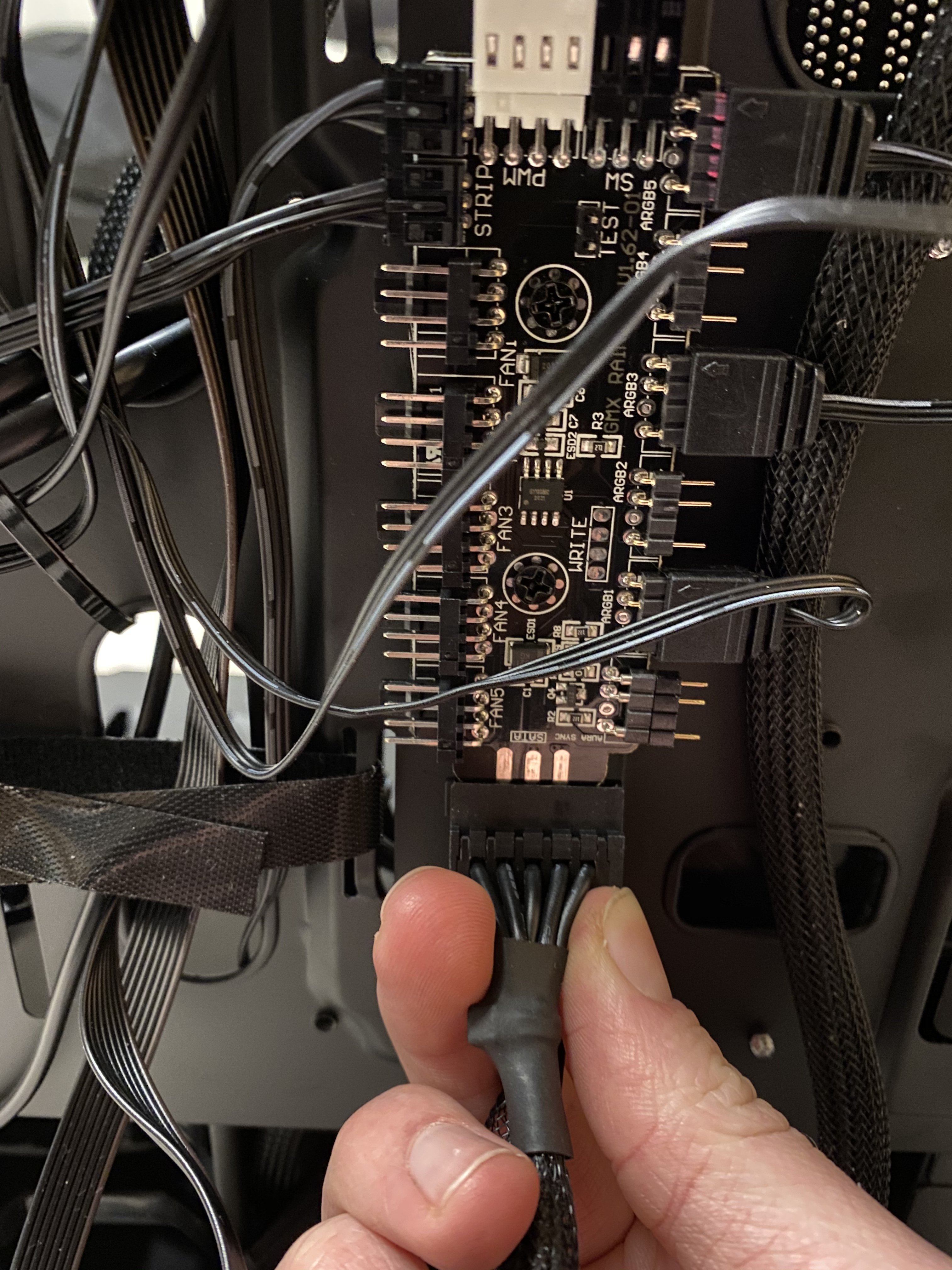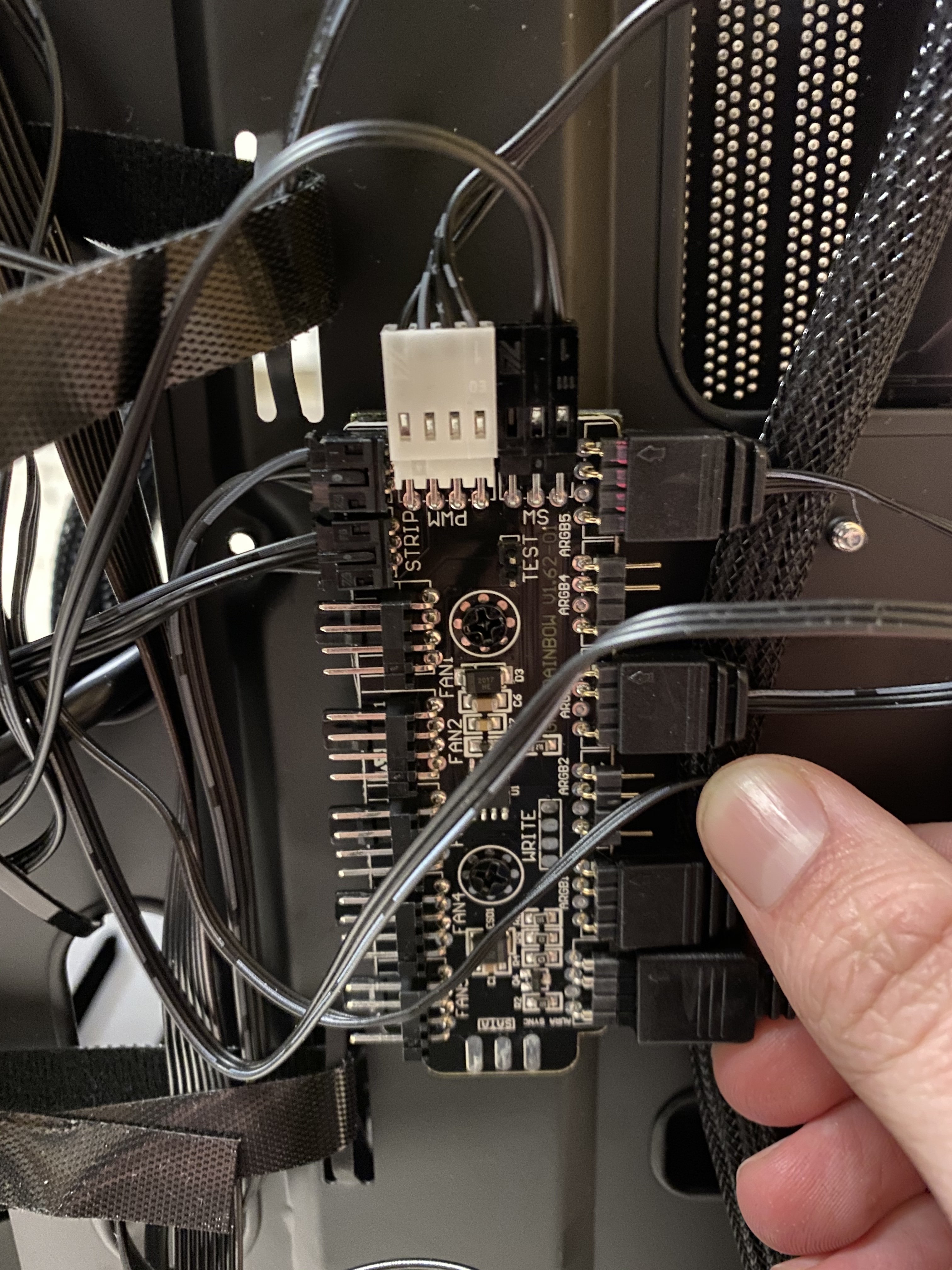 Wenn ich die Steuerplatine am MB Rainbow (4) mit dem Mainboard verbinde, leuchten nur die LED-Streifen von dem Gehäuse. Diese haben aber eine Leuchtmuster welches wahrscheinlich nicht gewollt ist ( leuchten rot) ( Muster sieht fehlerhaft aus). Über den Knopf (R) am Frontpanel ist keine Veränderung im Muster möglich, stattdessen fährt der Computer manchmal runter und sofort wieder hoch. Mit der möglichen Fehlerursache im Handbuch kann ich das Problem auch nicht lösen, weil den PMW-Stecker (2) und MS Rainbow(4) können nicht falsch herum eingesteckt werden. Verwendet habe ich die stecker CPU Fan-2 (normale FAN anschlüsse wurden auch probiert) und den ADDR_LED2 auf dem Mainboard.
