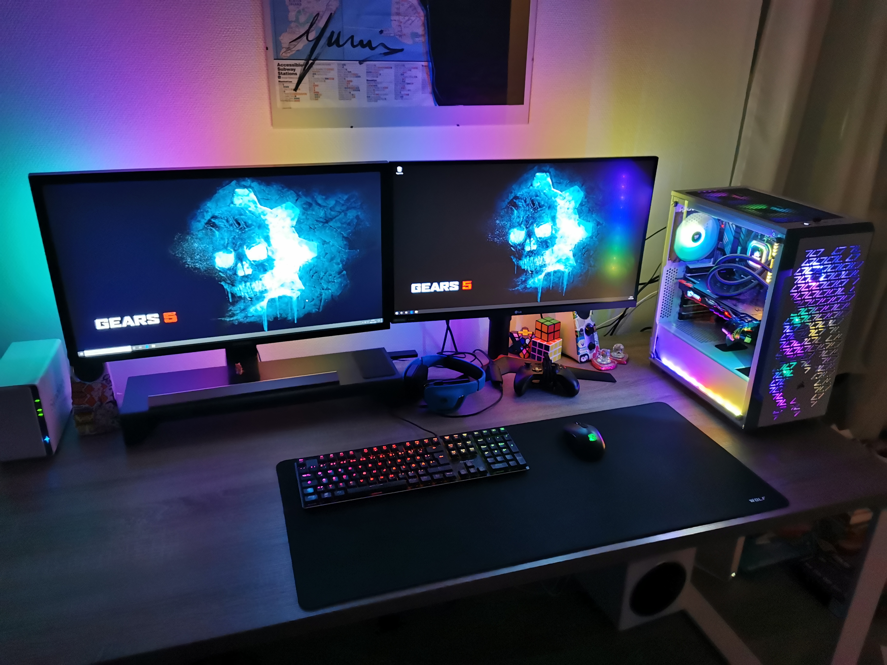 Gefunden habe ich bis jetzt das Corsair LS100 iCue System, welches sich für einen 34 Zoll Monitor erweitern lassen sollte sowie sich in der Farbdarstellung mit den Bildschirmrändern synchronisiert.
