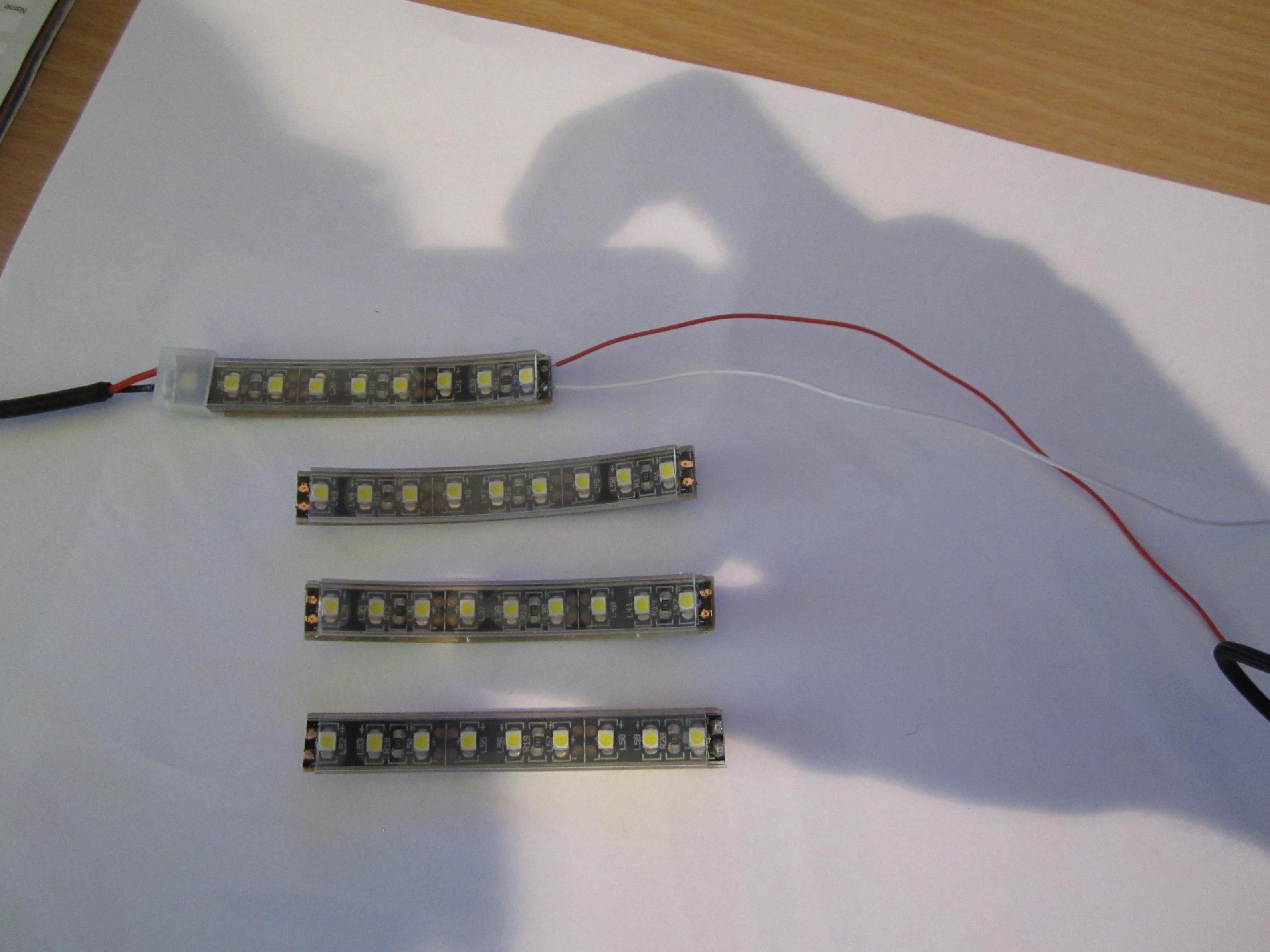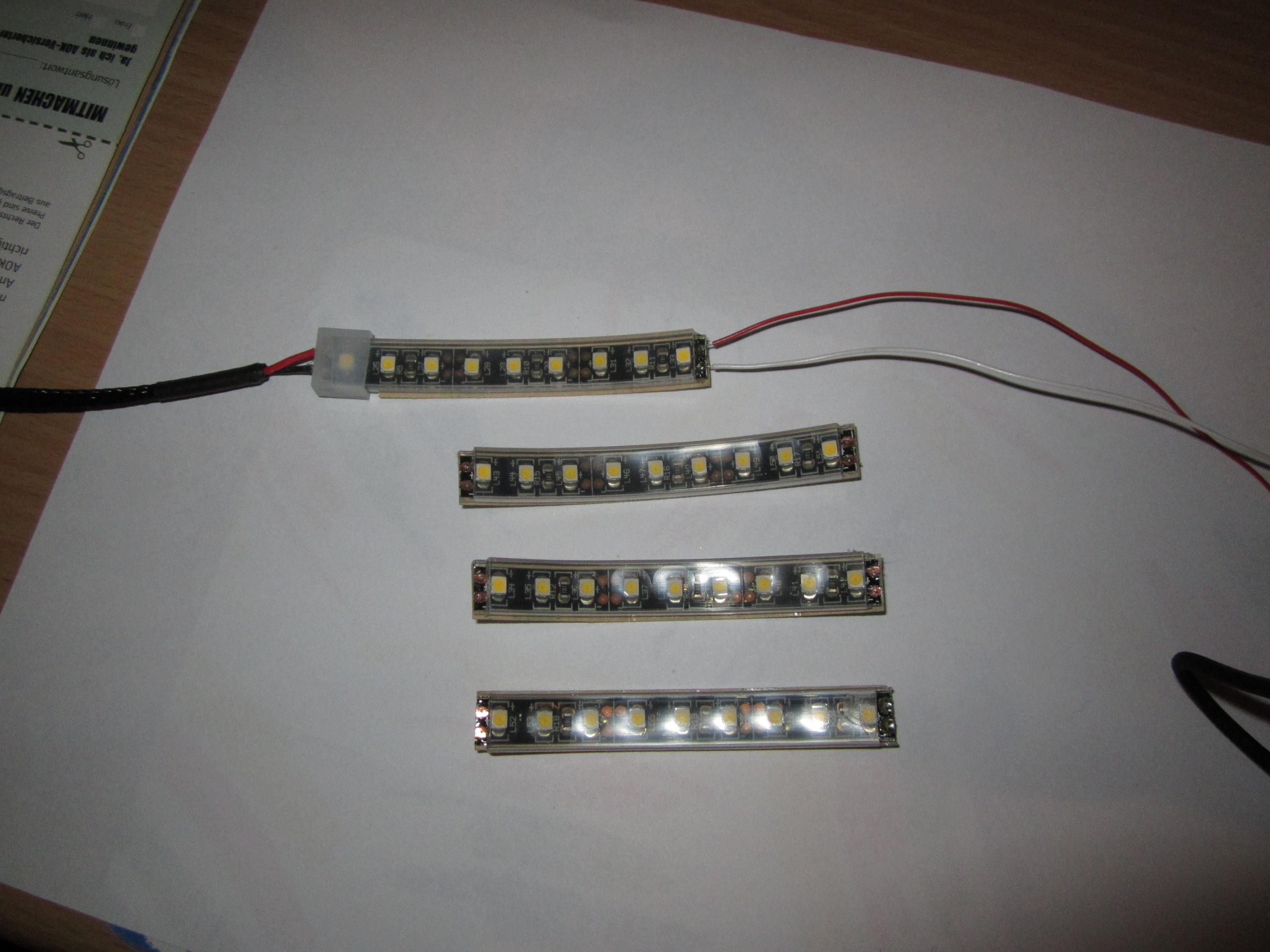 Ich habe die Leiste in white warm genommen, da ich wie Ihr anhand der Bilder erkennen könnt, den Farbton und vorallem die Intensität der Farbe mit Folien selbst bestimmen kann. Als Folie kommt alles, was man so findet, in frage. Ich benutzte einfach einen transparenten Schnellhefter. Eines noch. Die LED Leiste ist aufgebaut, dass man sie an den markierten Stellen trennen kann. Wenn man die einzelnen Stücke vor sich liegen hat und sie durcheinander bringt,