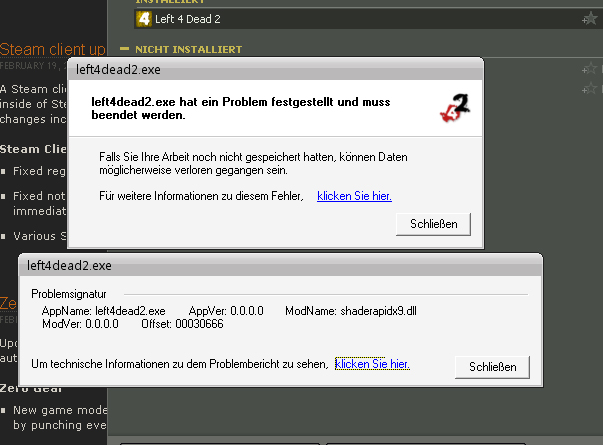 Nach der Installation startet das Spiel nicht. Es kommt nach Doppelklick auf das Icon (oder in Steam) gleich die Fehlermeldung „left4dead2.exe hat ein Problem festgestellt und muss beendet werden“.