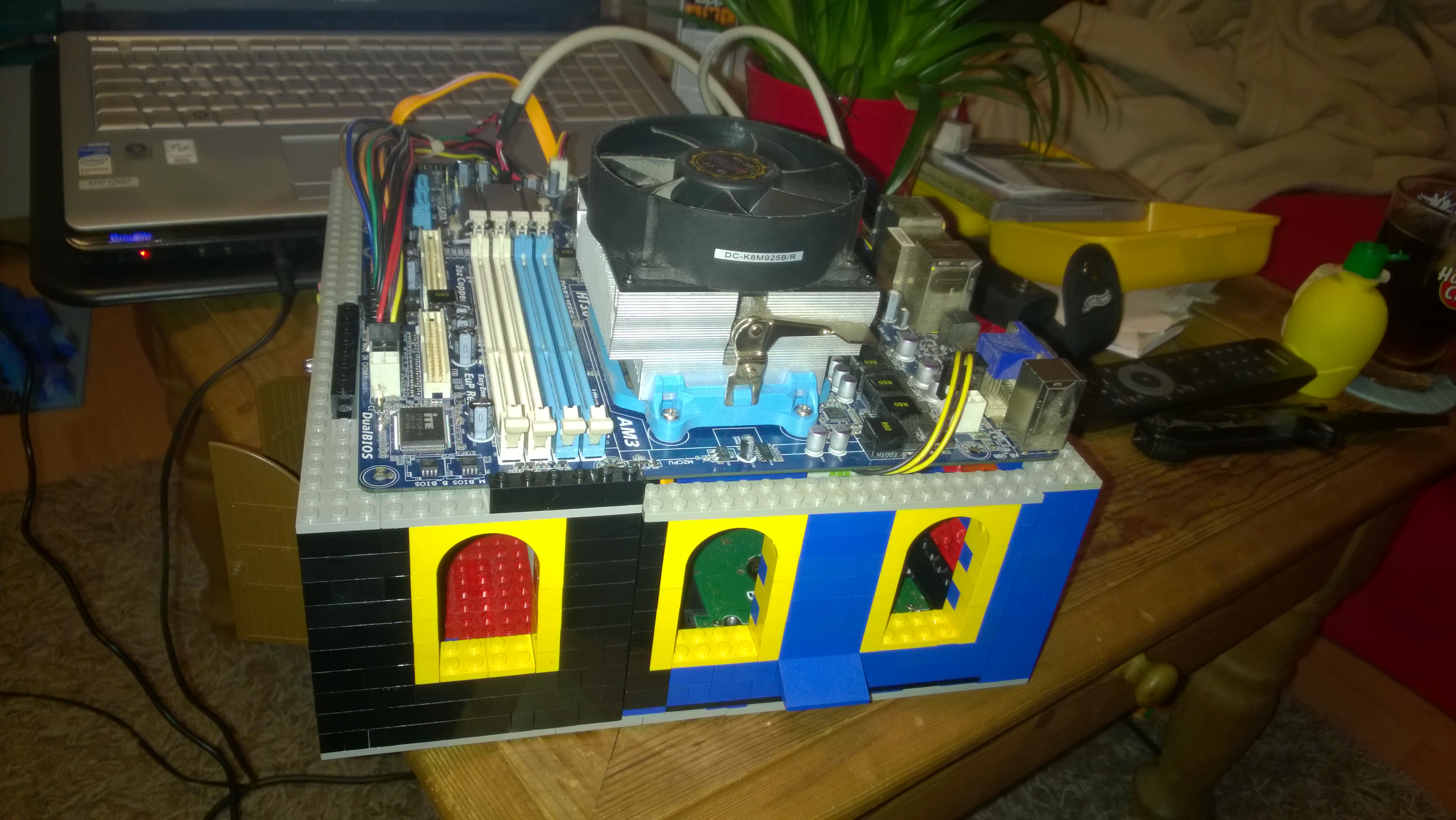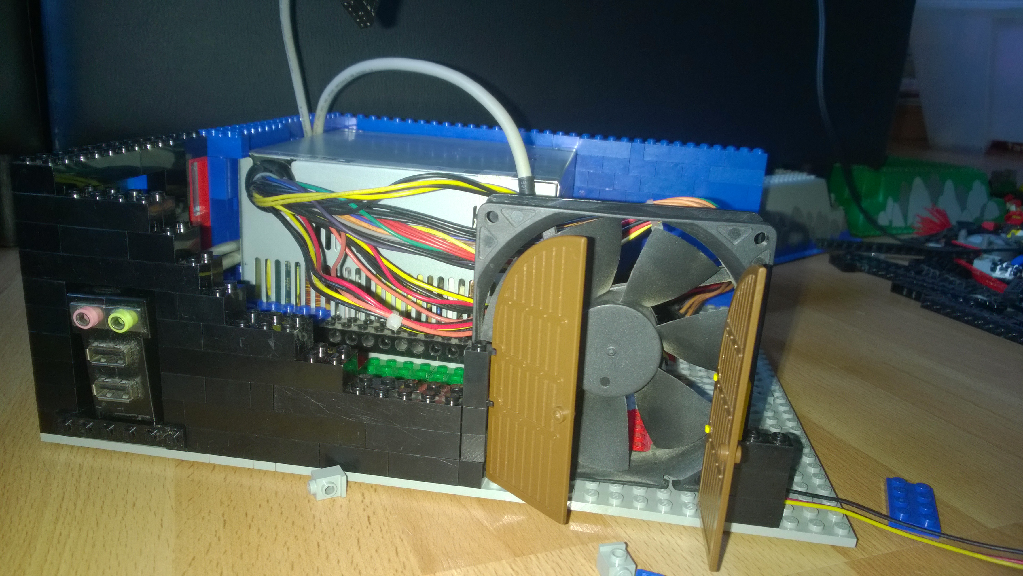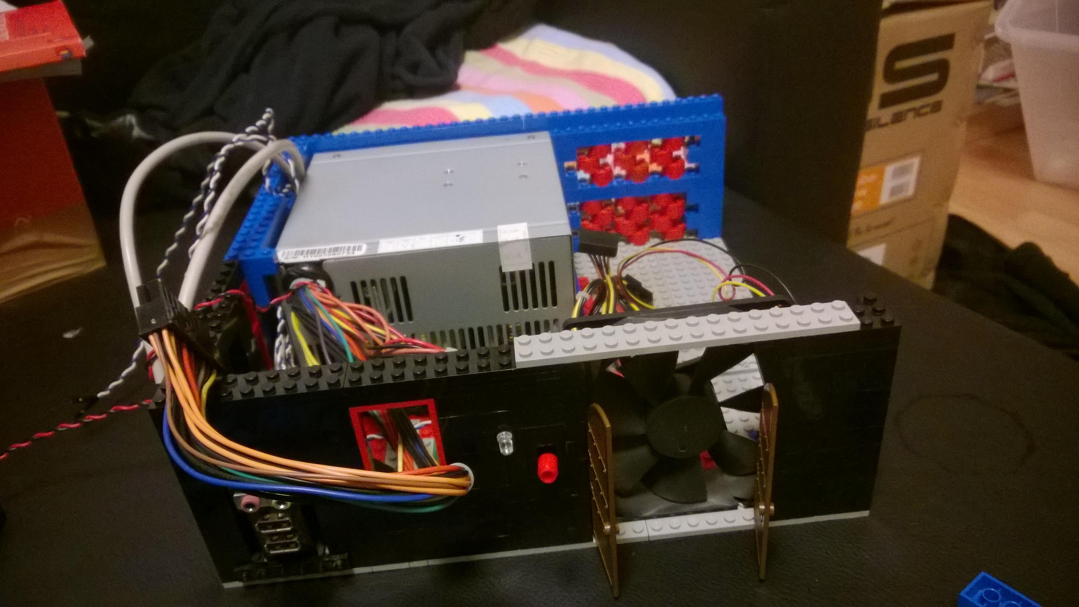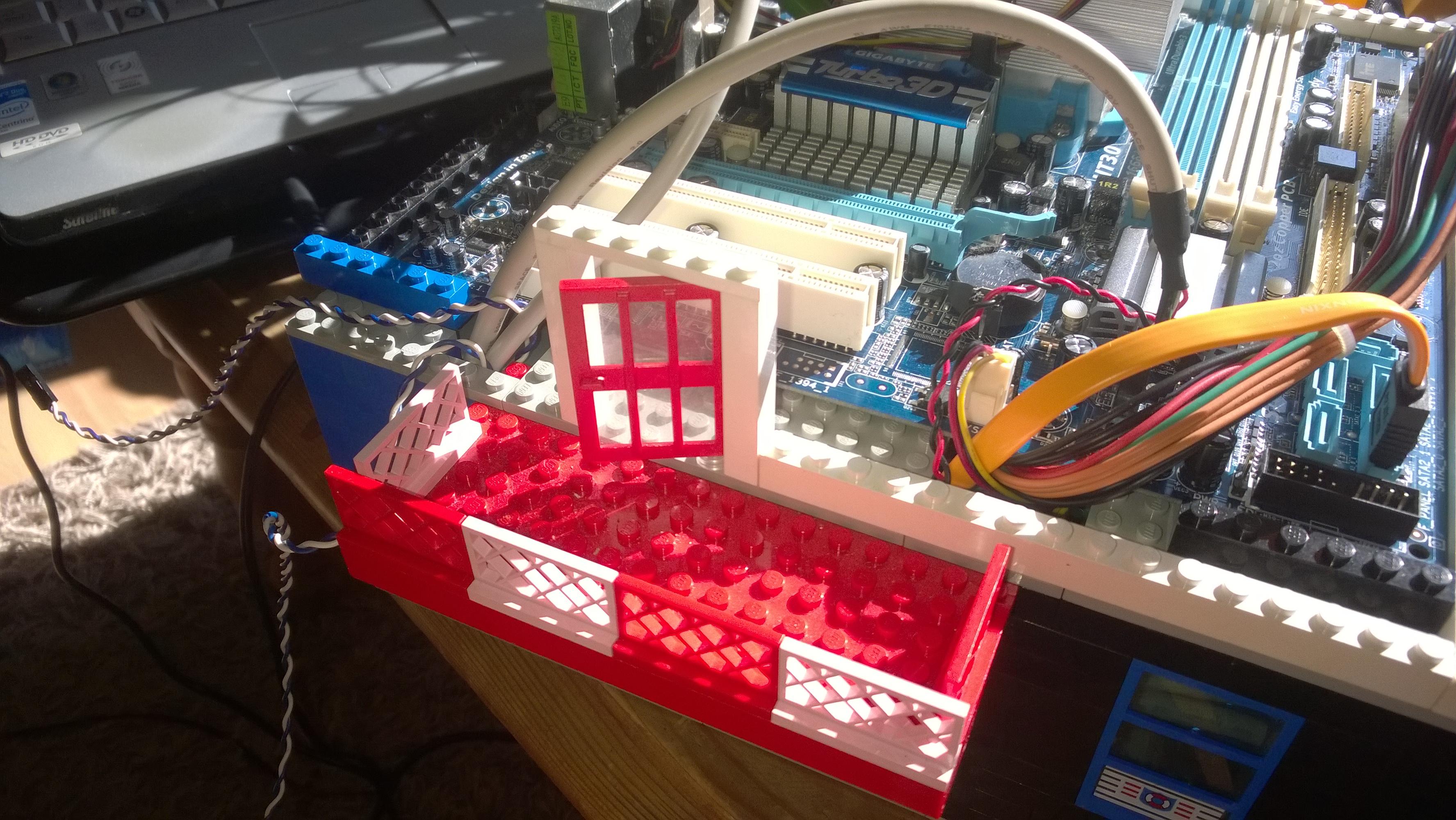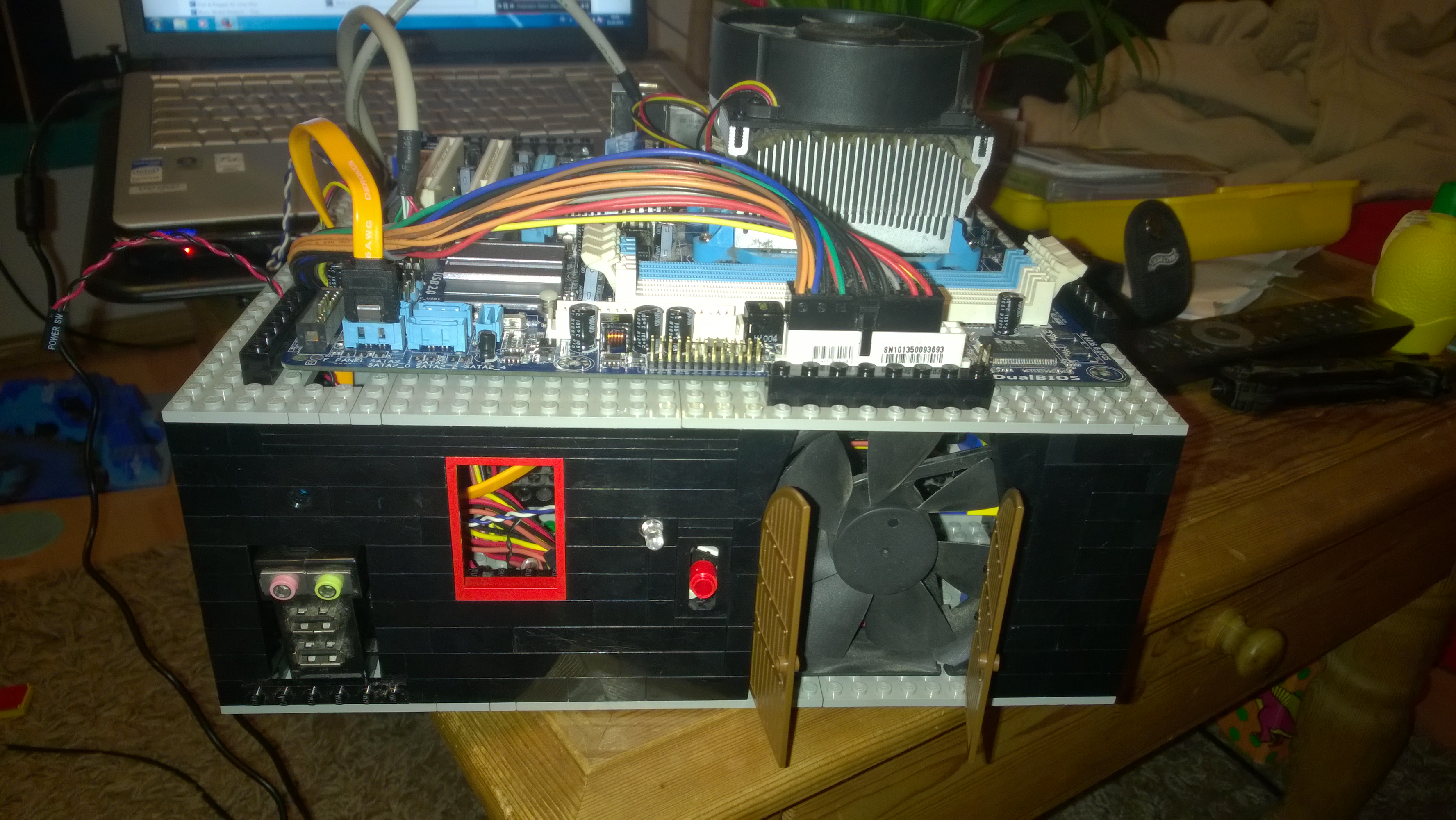 Nun war es Zeit für das Mainboard. Ein paar Kabel hier durch quetschen, eine kleine Säule dort zur Stabilität hinsetzen, ein Legostein hier weniger und schon passt alles.