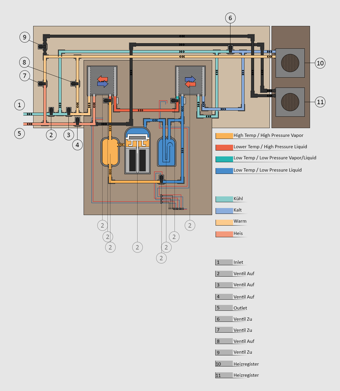 Die erste Reihe, ist eine wassergekühlte Klimaanlage und durch das Schalten von Ventilen bestimme ich die