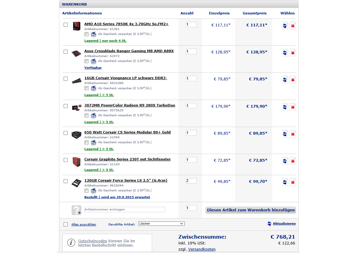 ich habe noch wenig Erfahrung (AMD-Systeme) und suche einen kleinen gamer-PC. Hauptsächlich spiele ich Blizzard-Spiele (1080p). Ab und an drehe ich auch ein paar Runden auf der Nordschleife in Project Cars mit mein Logitech G27. Unten habe ich einige Komponente zusammen gestellt. Sicher bin ich mir aber nicht, ob das Preis/Leistungsverhältnis (max. Budget 800 Euro, Win vorh., prio AMD-System) passt.