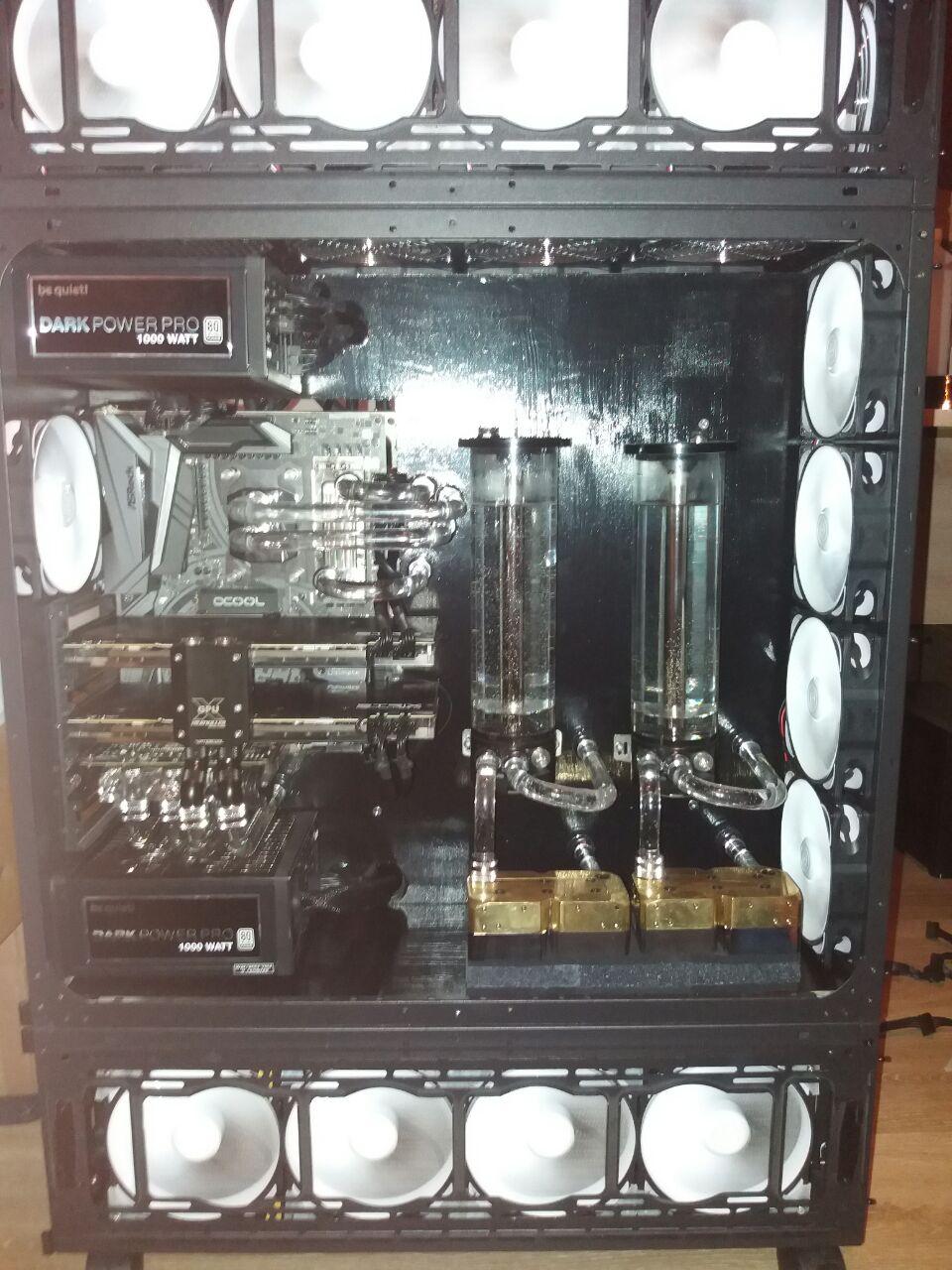 Ich habe einen sehr großen Kreislauf, bei den ganzen Winkeln, um Radiatoren in den letzten Ecken zu verbauen, dazu Schnelltrennern, um nicht immer das ganze System ablassen zu müssen und im GPU-Kreislauf (ich weiß, dass mehrere Kreisläufe sinnlos sind) parallelen Karten braucht es schon etwas. Und ich mag Dual DDC Tops. Theoretisch sollte man dann nichts mehr hören, das war auf Schlauch auch noch so, für die Optik Hardtubes verbaut und schön Vibrationen aufs Gehäuse übertragen. Wenn eine komplette Platte mit Gehäusedurchführungen und die ganzen Rohre nicht so ein Aufwand gewesen wären, hätte ich das schon längs wieder geändert.