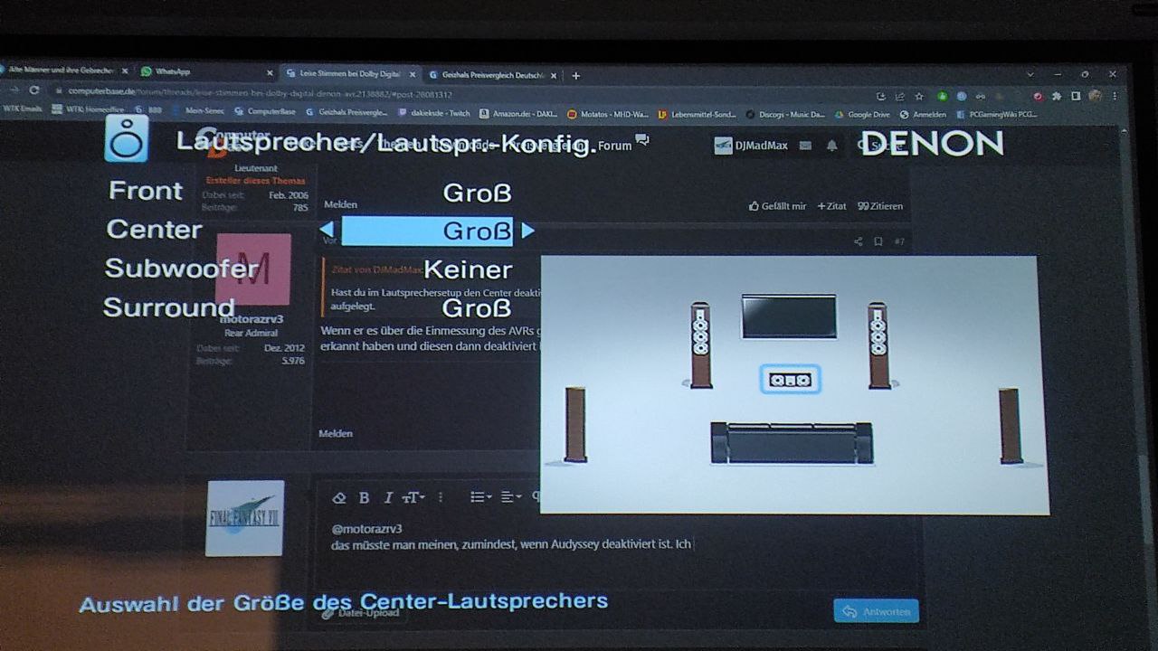 Gehen wir mal davon aus, dass alles so weit richtig eingestellt ist, was nach der Einmessung zu großen Teilen der Fall ist. Hier bitte nichts ändern wenn man nicht weiß, was man tut. Allerdings benötigt Audyssey durchaus einige Feinjustierung wenn man den bestmöglichen Klang will. Dafür muss man aber auch seine Lautsprecher kennen und ungefähr wissen, was man erwartet. Aber das hat erst mal nichts mit zu leisen Stimmen zu tun. Wenn es keinen Center gibt und das auch so eingestellt ist wird der Kanal über die Front abgespielt.