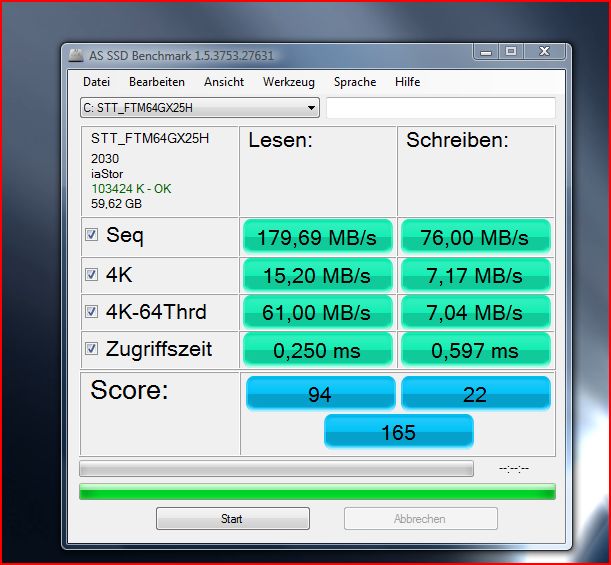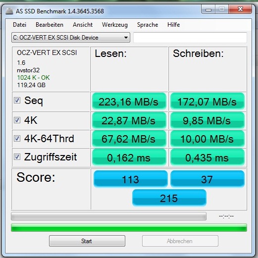 Ja, schreiben sollte sequentiell auf 120-130 MB/s gehen, 4K-64Thrd schreibend auch bis ~120 MB/s. Bei Google findet man aber auch viele Screenshots von Usern mit bis auf 75 MB/s runter. Vielleicht ist das der berühmte Leistungseinbruch bei den Sandforce-Controllern. Wie lange hast du die SSD schon und wie viel hast du schon geschrieben/gebencht?