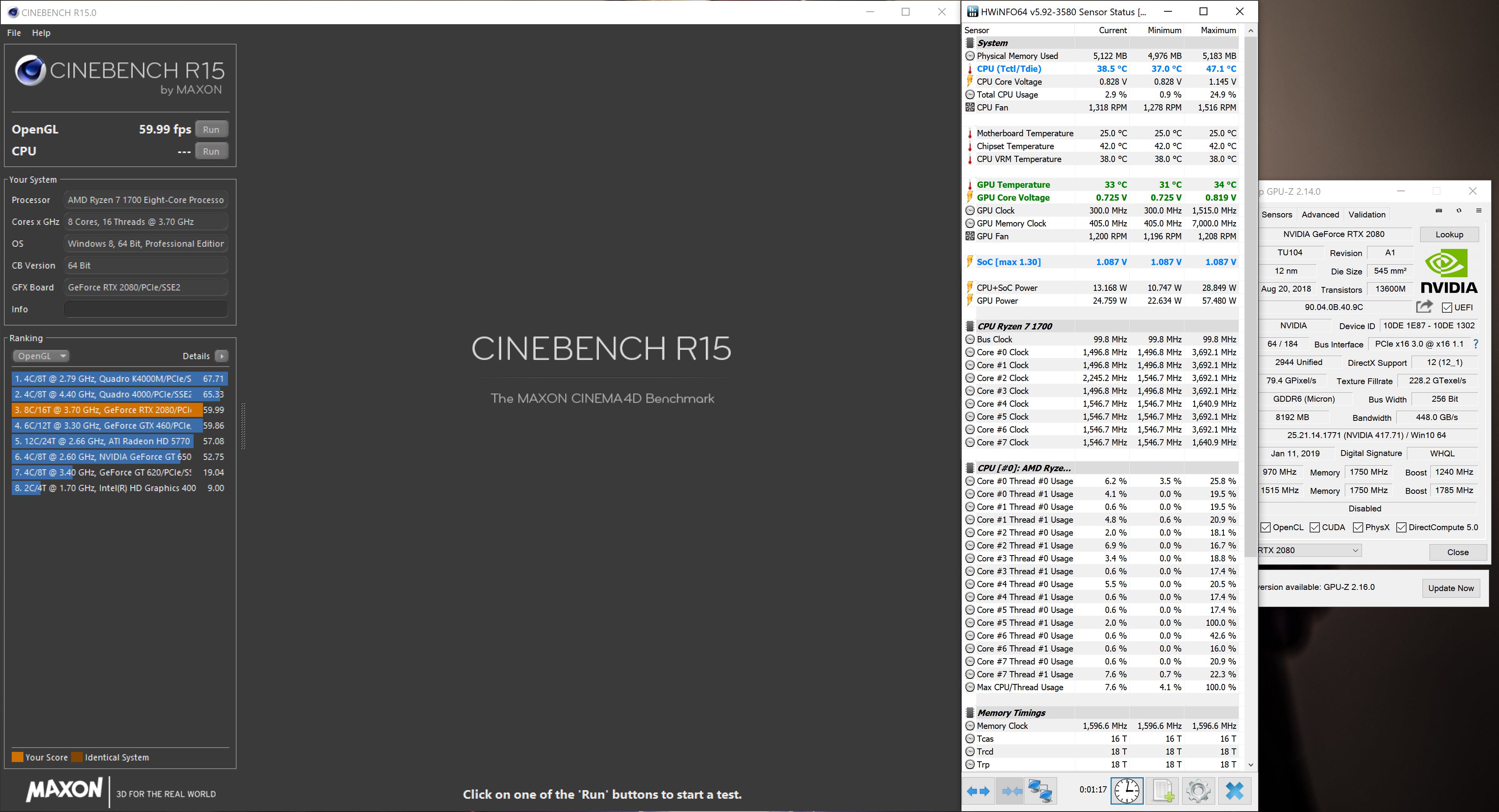 Zotac2012 schrieb:Also der Wert im Cinebench R15 von der Grafikkarte im Open GL ist definitiv nicht in Ordnung, der müsste weitaus höher sein, bei mir liegt dieser Wert mit meiner GTX 1070 mit meinem i5 8600K@5,0 GHz bei 184 FPS. Auch mit einem Ryzen 1600X sollte dort der FPS Wert deutlich über 100 FPS liegen. Ob die Probleme allein nur an der GPU liegen, lässt sich so einfach nicht sagen, das kann man eigentlich nur testen, wenn man die Grafikkarte mal in einem anderen Rechner einbaut und schaut, wie diese dort Performt!