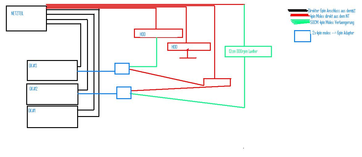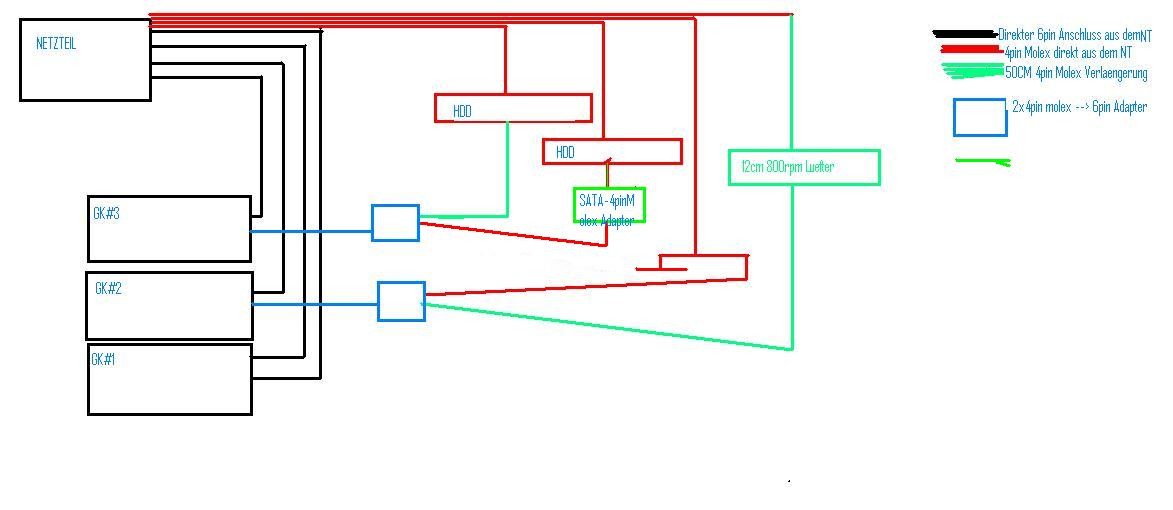 Die beiden Adapter moechte ich dann allerdings etwas auf die GK's verteilen sodass GK #1 die normalen 2x 6pin direkt aus dem Netzteil hat, GK#2 einen 6pin direkt aus dem Netzteil und eine genannte Adapter Konstruktion, und GK#3 ebenso einen direkten 6pin Netzteil Anschluss besitzt und dazu, ihr koennts euch denken, eben so eine Adapterkonstruktion.