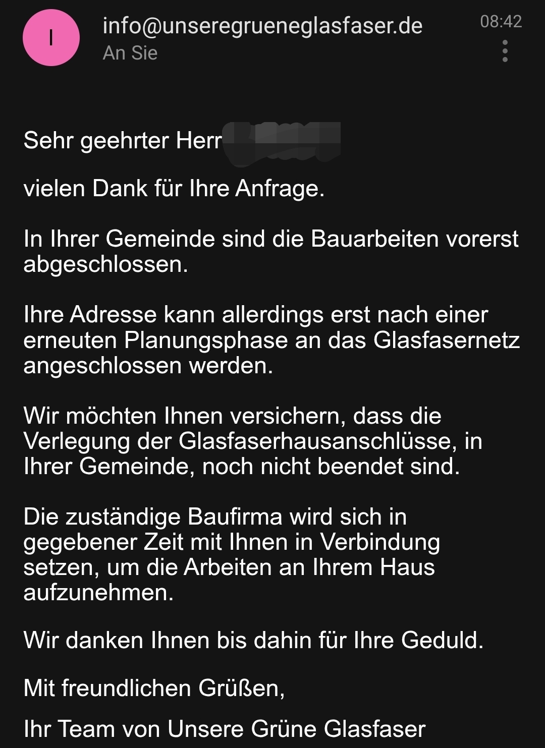 Unterm Strich habe ich seit Jahren ein vorbereitetes Glasfaser-Leerrohr direkt am Verteiler, komme aber nicht in den Ausbau, weil Zuständigkeiten und Gebietseinteilungen das nicht vorsehen. Verständlich ist das nicht – die komplette Vorbereitung liegt vor –, dennoch bleibt es so, weil der Ausbauplan unser Haus formal nicht umfasst.