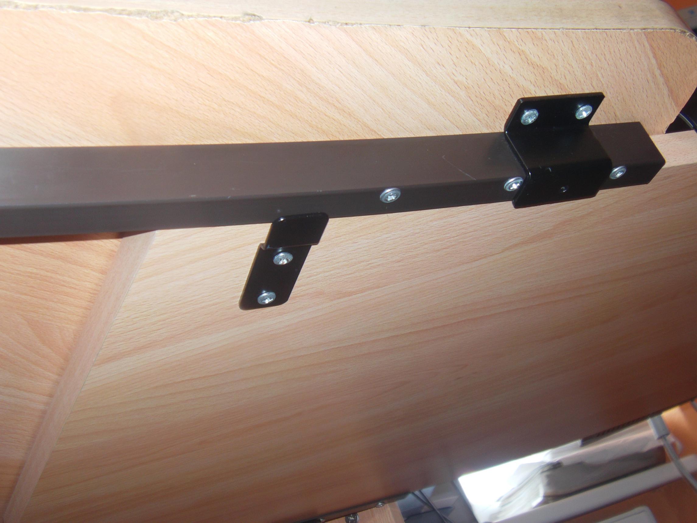 Das Problem: Mein Computertisch hat eine Leitschiene, an der ein zusätzlich ausfahrbarer Nebentisch befestigt ist. Diese Leitschiene ist 6,3cm vom Tischrand entfernt. Aus dem Grund konnte ich das alte Thrustmaster T2 nicht richtig nutzen.