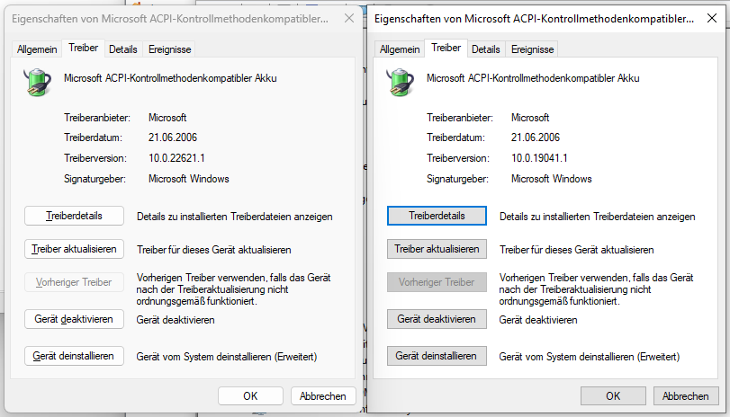 Nun habe ich mich mal selbst ran gemacht, die Treiber verglichen (W10 = v10.0.19041.1, W11 = 10.0.22621.1), alles über dism exportiert, worin der Akkutreiber nicht enthalten war. pnputil versucht, gleiches Problem. Und dann bin ich auf folgenden Text gestoßen: