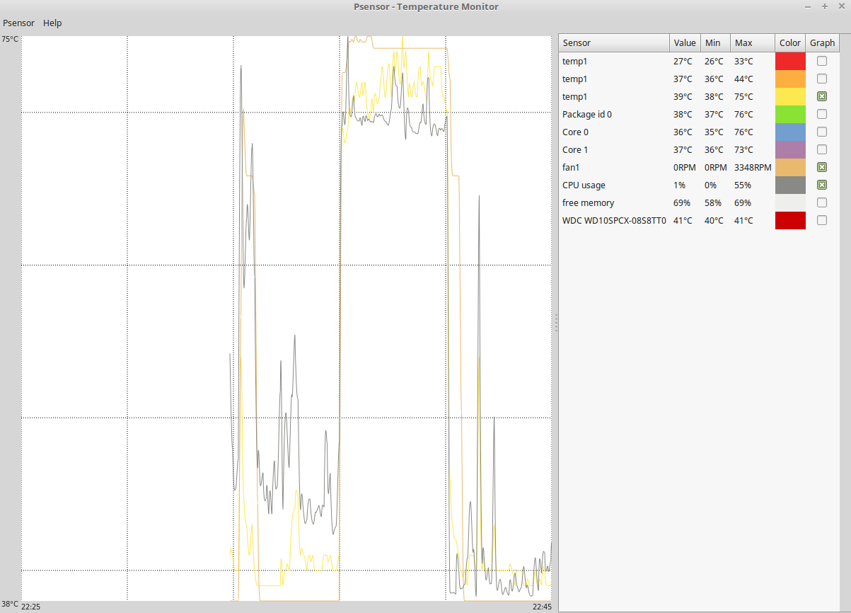 Mit Sppedfan sehe ich, dass der Sensor Temp1 immer zwischen so 41 °C und 57 °C schwankt. Der Lüfter geht bei 57 °C sehr laut an (ich würde mal schätzen so 50%) bleibt dann für mehrere Sekunden dort, die Temeratur sinkt wieder und der Lüfter ist nicht mehr zu hören. Das wiederholt sich dann immer mal wieder. Und das ist einfach nur nervig. Wie stark der Lüfter wirklich an ist kann ich mit Speedfan nicht ermitteln, da die Drehzahl wohl nicht abgegriffen werden kann.