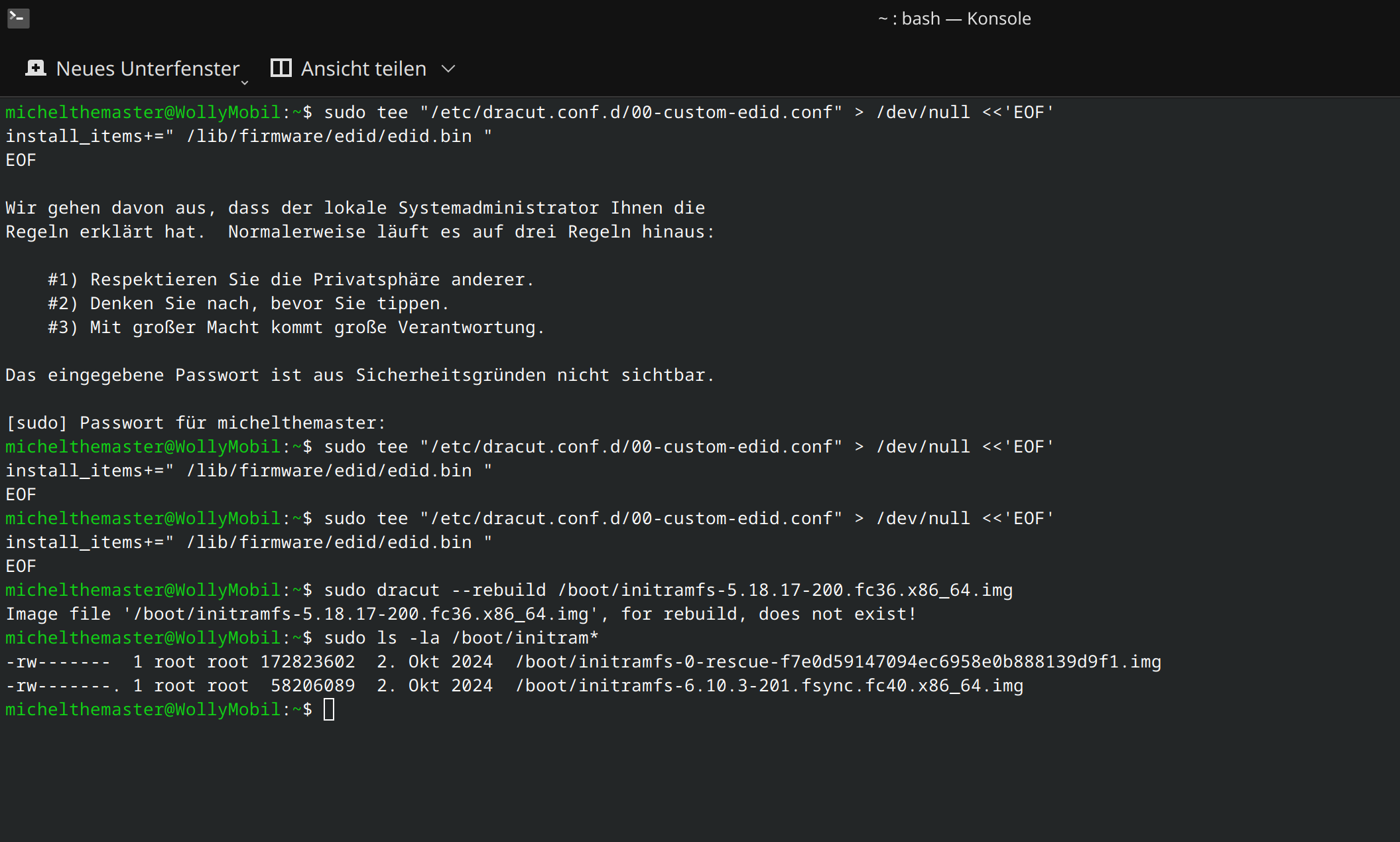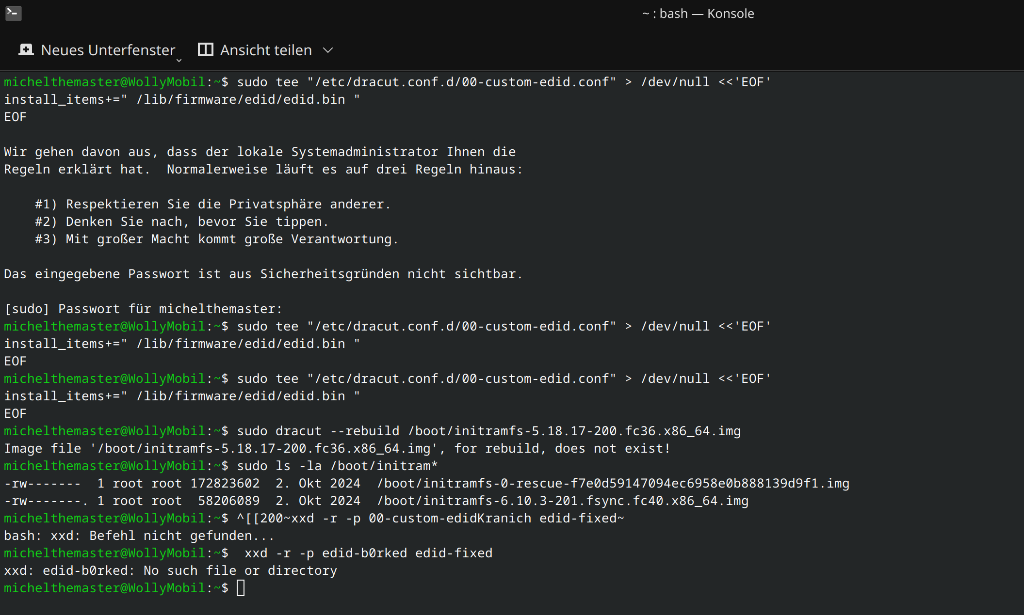 Danke für die ausführliche Anleitung. Ich stehe aber an, dass ganze unter Fedora 38 zum Laufen zu bringen. Grub konnte ich noch aktualisieren, initramfs-tools gibt es aber unter Fedora nicht. Das Pendant dazu heißt anscheinend dracut, hab jedoch keine Ahnung wie die Befehle dafür lauten und wäre um Hilfe sehr sehr dankbar.