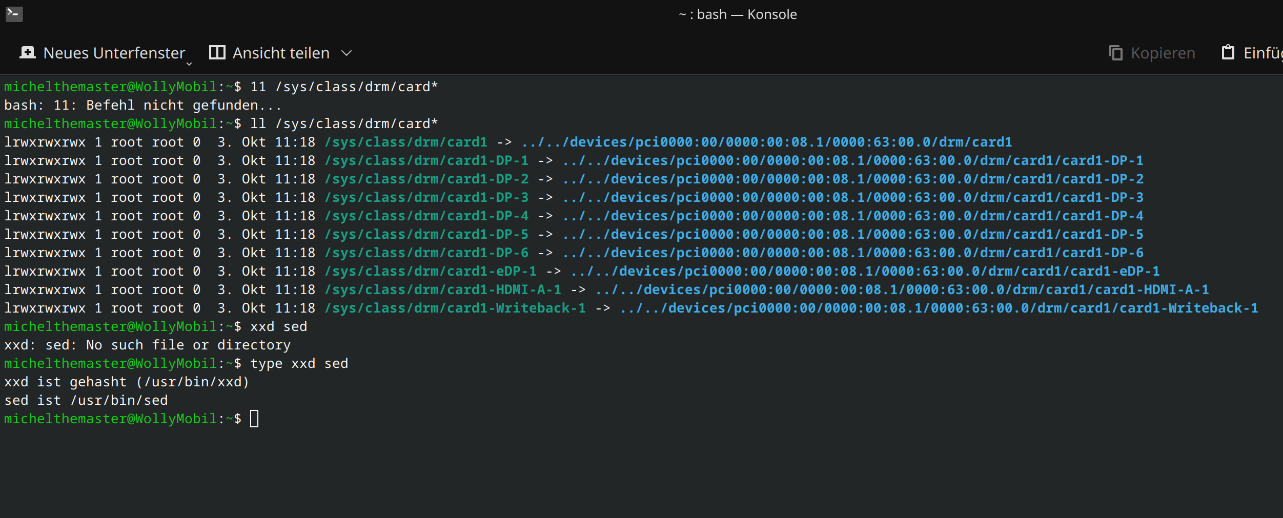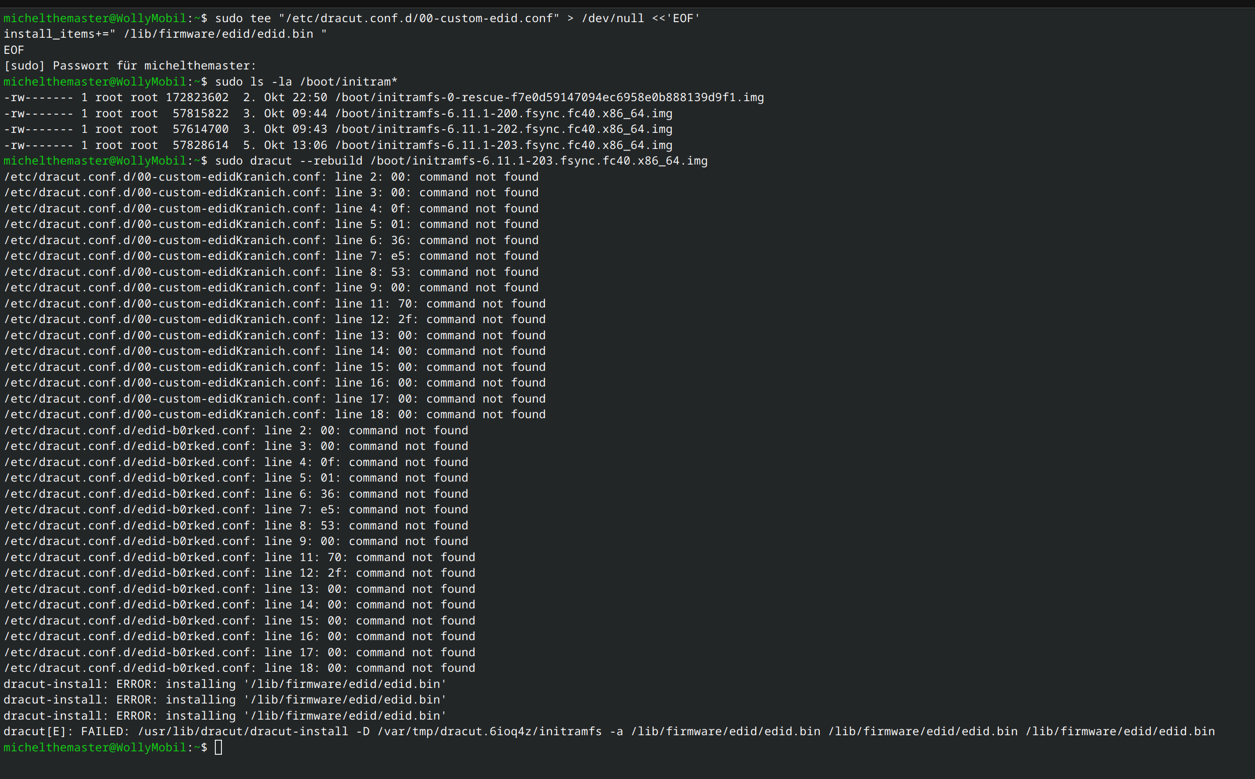 Der erste Befehl "xxd -p /sys/class/drm/card1/card1-eDP-1/edid" hat wohl funktioniert. Der zweite Befehl "sed -E 's/f098$/f890/g'" scheint aber irgendwie zu hängen, also in dem Terminal geht es nicht weiter... Und der dritte Befehl ist wahrscheinlich abhängig von Befehl 2, funktioniert also auch nicht.