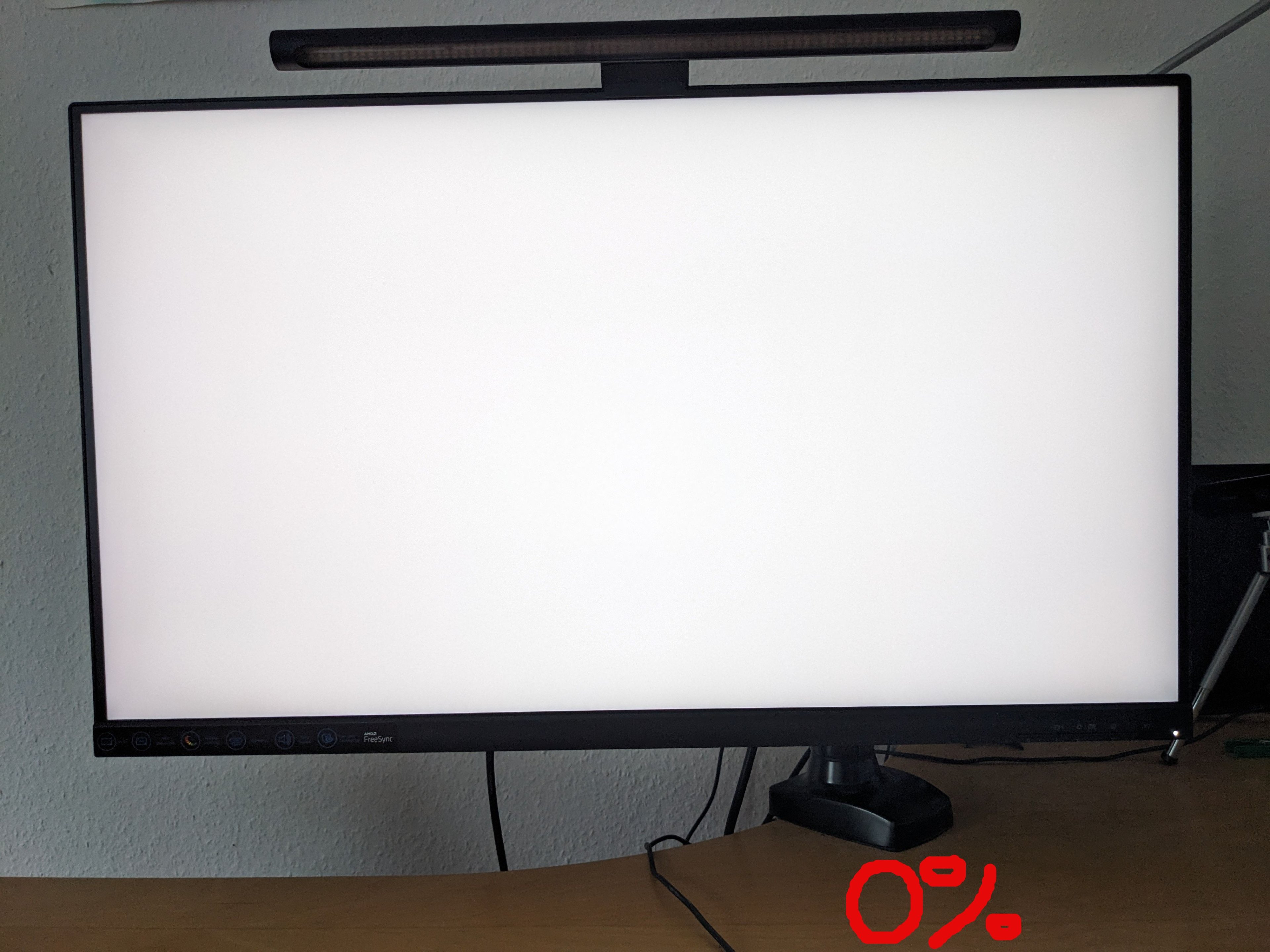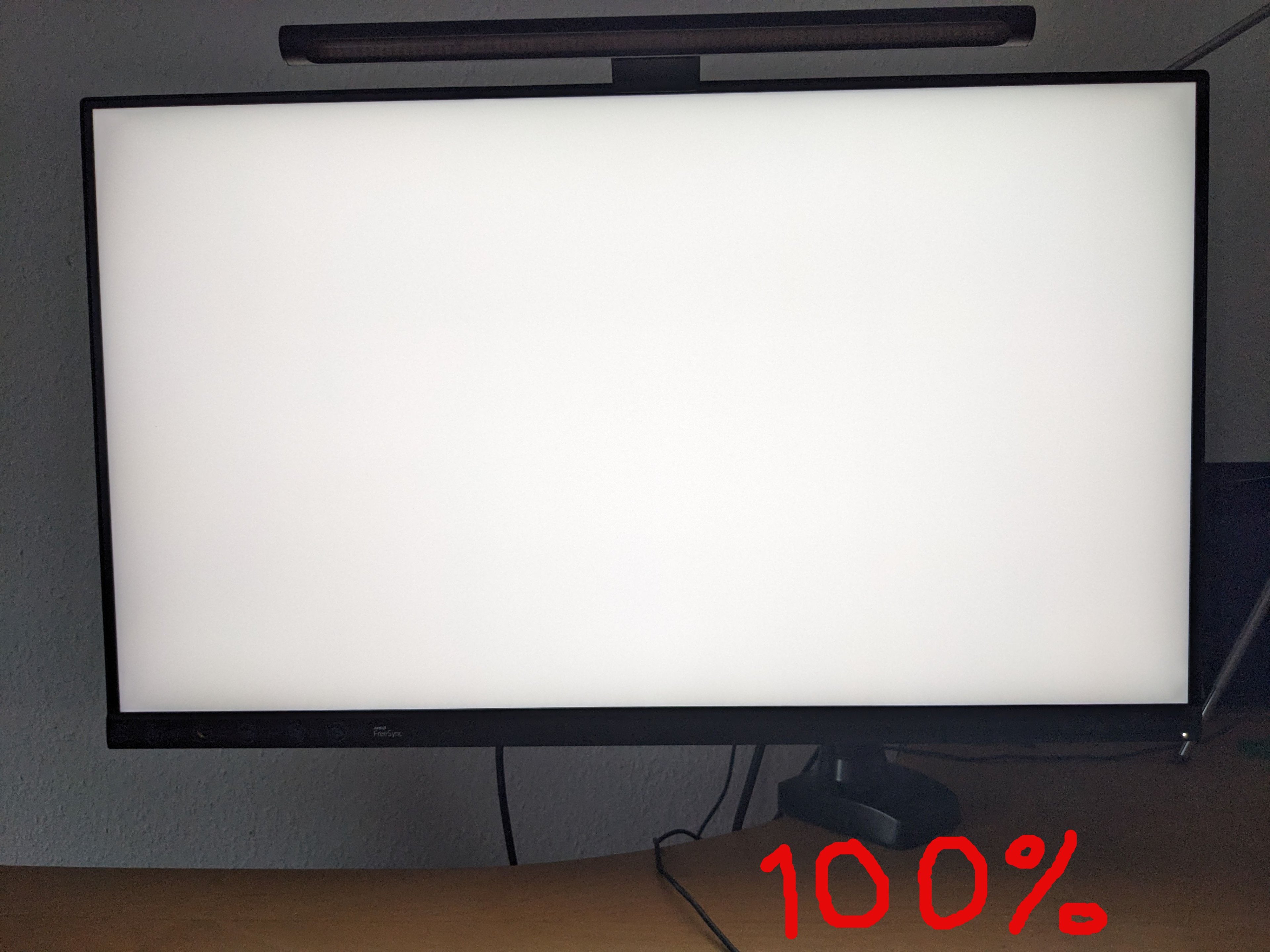 Ich habe noch zwei Bilder angefügt, wo man es hoffentlich gut erkennen kann. Der Monitor ist auf Werkseinstellung zurückgesetztund einmal mit 0% Helligkeit und einmal mit 100% Helligkeit abfotografiert. Ich habe mir den weißen Hintergrund von der Webseite deadpixeltest.org darstellen lassen im Vollbild Firefox Browser unter Ubuntu.