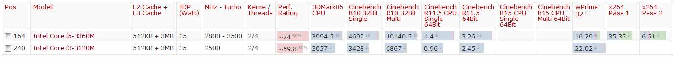 ich hab gerade rausgefunden, dass meine Notebook-CPU gesockelt ist. Jetzt kommt der *will-haben*-Effekt (i3 3120M auf i5 3360M). Lohnt sich das eurer Meinung nach? Bis zu welchem Gebraucht-Preis? Anwendungen sind Dota2, MATLAB, Origin, Python, also durchaus immer wieder mal sehr CPU-lastig. Auch die Grafik profitiert vom Upgrade oder? Ich hab mal die notebookcheck Benchmarks angehängt, kann ich von 33% höherer Punktzahl auf 33% mehr Leistung (pi mal daumen) schließen oder sind die nichtlinear?