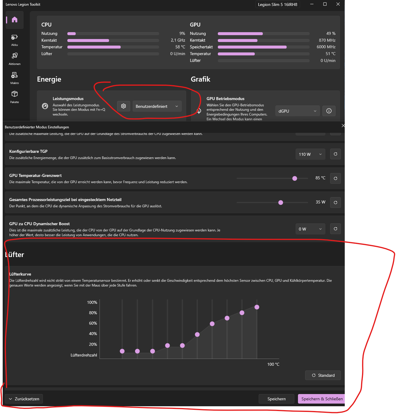 Den benutzerdefinierten Modus kann ich nur mit Ladegerät aktivieren und da kommt auch nichts mit Lüftern, außer "maximale Lüfterdrehzahl"
