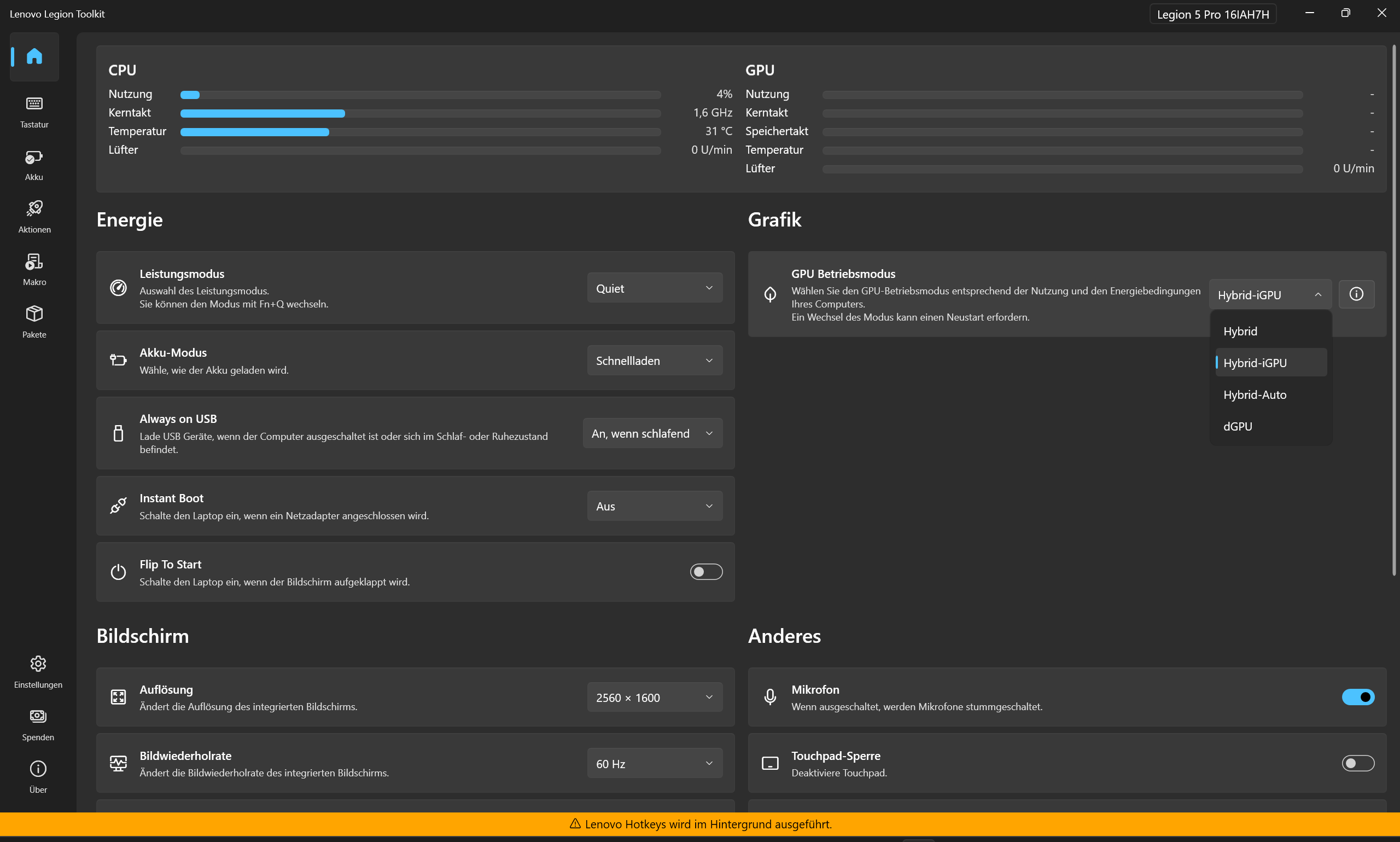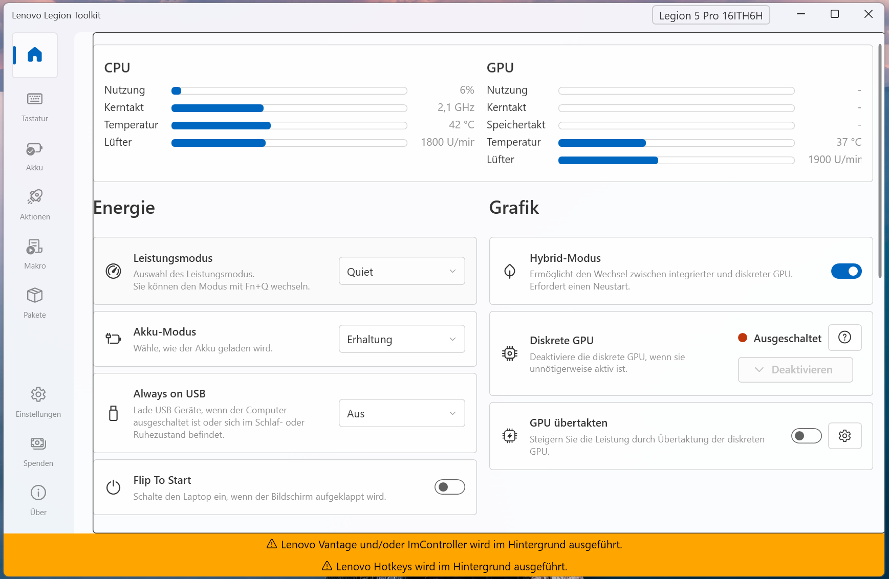 Es kann doch nicht wahr sein, dass Lenovo in 800€ LOQ Modellen manuelle Einstellungen erlaubt und im Preisbereich von 1700€ nichts verändern werden kann. Zumal es sich auch bei mir um ein permanent "lautes" Notebook handelt.