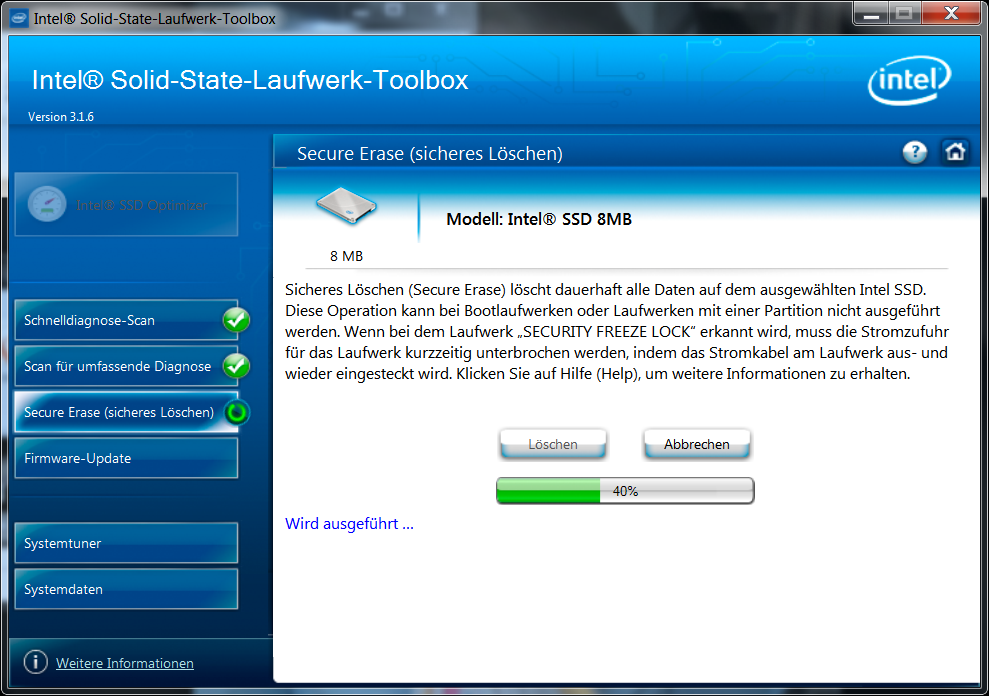 Nun hab ich von dem Bug gelesen, den einige Intel SSDs wohl hatten, und wollte das mit dem Firmwareupdate beheben. Wenn ich aber das Firmware Update Tool boote, meint es, dass die Firmware aktuell ist und das die SSD 0GB hat.