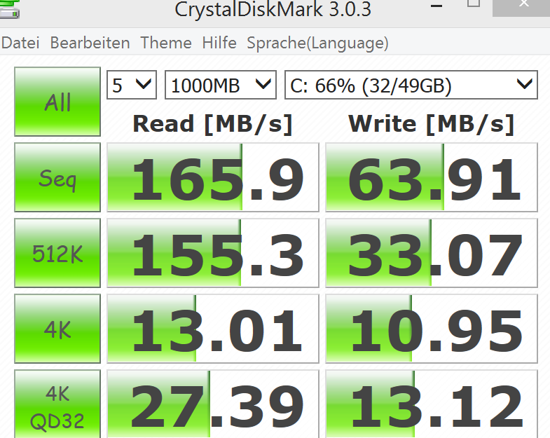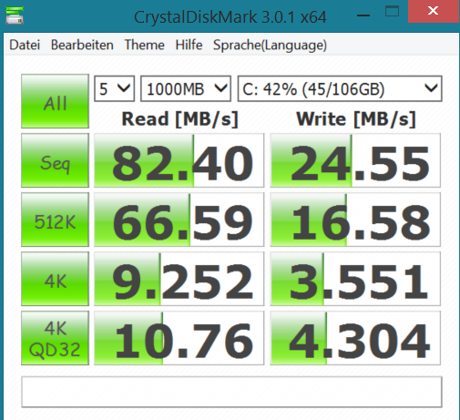 - Jetzt, wo das Tablet im Grunde produktiv nutzbar sein sollte, habe ich zunächst die Leistung des 128 GB großen Speichers (SanDisk SEM128) getestet und bin verunsichert, denn wenn ich die Leistung mit der aus diversen Tests vergleiche, so ist diese zwei bis fast drei Mal niedriger, siehe hier: