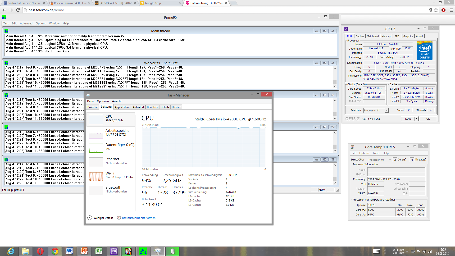 Meiner Meinung wäre hier sehr viel mehr Spielraum nach oben gewesen, da man auf diese Weise das Notebook schon um ein wesentliches Stück seiner Leistungsfähigkeit beraubt. Ich hatte kurz auch ein Aspire V573G hier, das ebenfalls mit einem i5 4200U ausgestattet ist, und das war in allen CPU-Benchmarks, die ich bis jetzt durchführen konnte, wesentlich schneller, wurde aber klarerweise aber auch wesentlich wärmer (CPU bis 90°C).
