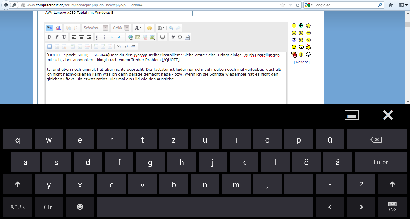 Ja, und eben noch einmal, hat aber nichts gebracht. Die Tastatur ist leider nur sehr sehr selten doch mal verfügbar, weshalb ich nicht nachvollziehen kann was ich dann gerade gemacht habe - bzw. wenn ich die Schritte wiederhole hat es nicht den gleichen Effekt. Bin etwas ratlos. Hier mal ein Bild wie die Tastatur mit breitem oberen Rand aussieht: