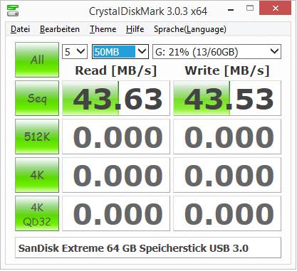 als ich den Stick heute ausprobierte, musste ich ernüchtert feststellen, dass ich gerade mal jeweils 40 MB/s Lese- und Schreibrate erreiche.