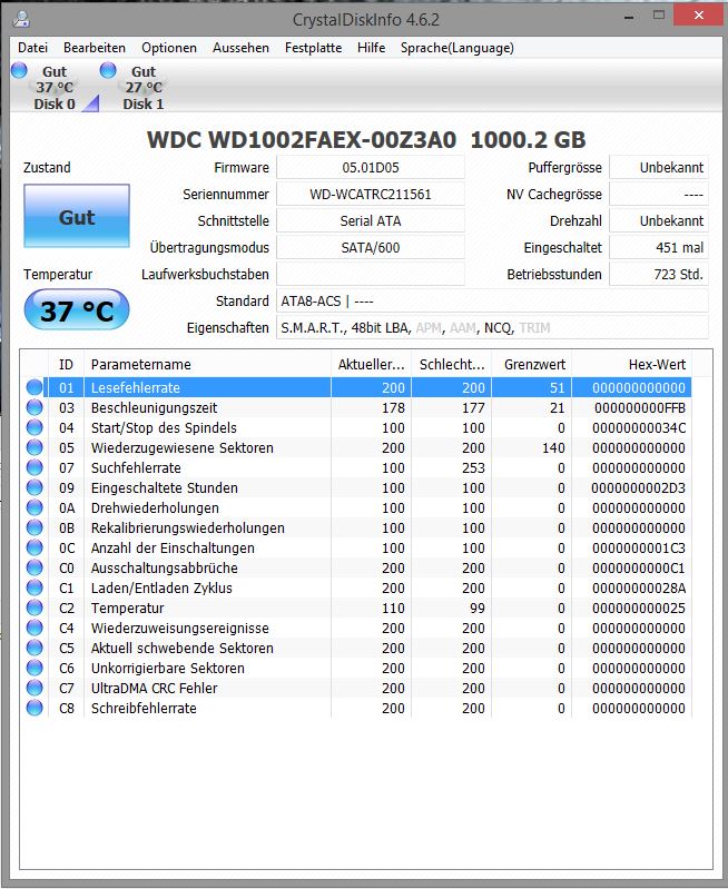 Mich hats nur erschrocken weil das Teil beimentpacken von Winrar auf einmal angefangen hat Geräusche von sich zu geben das ich dachte sie kommt mir gleich entgegen. Das Kopieren selbst geht vom tempo her auch normal er knüppelt mir die Daten von der WD auf die SSD auch mit 200 - 300Mb rüber dachte nur das diese Lesefehlerrate bedenktlich ist