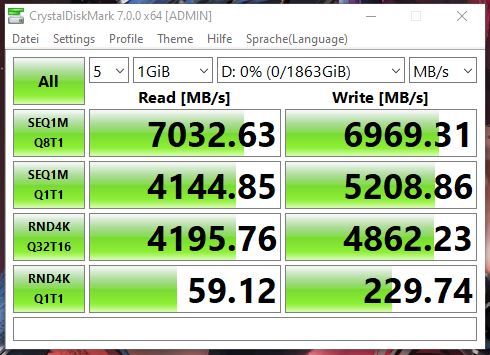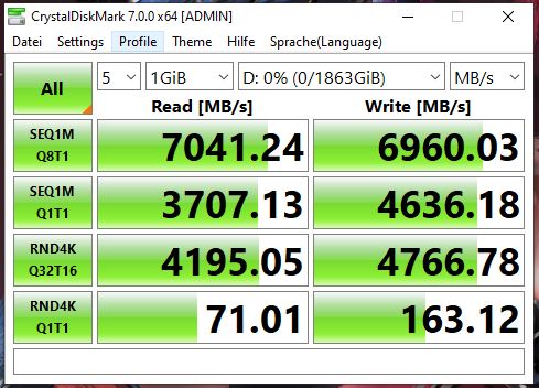 Nach dem Einbau habe ich ganz normal ins Windows gebootet (Windows 10 Pro - Version 10.0.19042 Build 19042) und habe über Crystaldiskmark 7.0.0 x64 ein Speedtest durchgeführt.