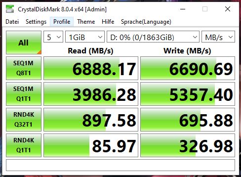 Zu meiner Ernüchterung musste ich leider feststellen, dass die von Seagate beworbenen 7300MB/s Lesend anscheinend nicht erreicht werden, und zu allem Überfluss auf der Verpackung der M.2 sogar ein Sticker klebt mit "up to" 7000MB/s.