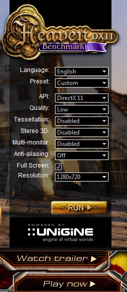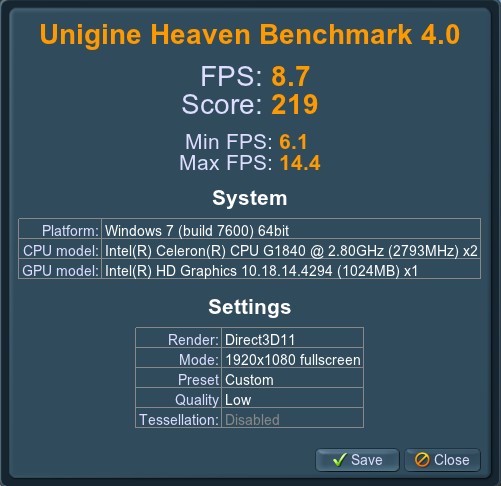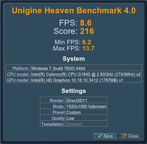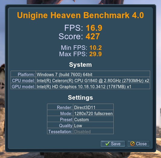 720p, low quality, aa + tesselation off: 15,6 FPS; 392 Punkte