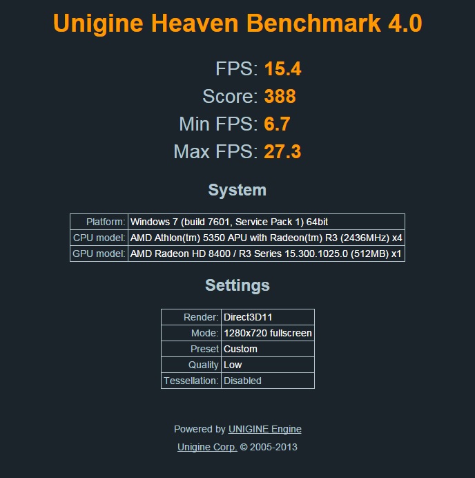 Ich bin schwer beeindruckt. Ich habe den -Benchmark gerade (unter DirectX11) mit meinem Notebook durchgeführt. Unter Verwendung von "720p, low quality, aa + tesselation off" kam die integrierte HD 4400 des i3-4010U auf folgendes Ergebnis fps: 14,4 - Score : 363. Das hätte ich nicht gedacht, dass die R3 des Athlon schon unübertaktet schneller ist und übertaktet mit einem Score von 466 sogar deutlich schneller.