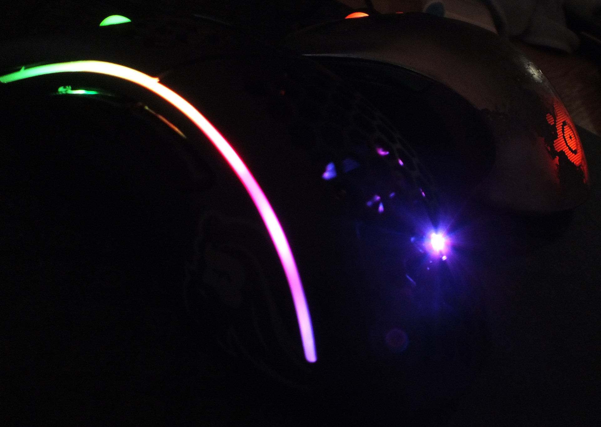 Tagsüber findet man die Maus etwas besser, ohne hinzusehen – doch nachts muss ich sie abschalten, da sie zu hell ist und beim Schlafen stört. Kleiner Nachteil sind auch die Löcher: denn nachts fallen einem je nach Winkel die LEDs von der Innenseite ins Auge, was einen sehr irritierenden Effekt haben kann. Für dunkle, atmosphärische Spiele also auch eher die Beleuchtung abschalten. Die Sensei dagegen hat durchweg ein rötlich-orangenes Glühen eingestellt, das Tagsüber zwar etwas blass wirkt, dafür dauerhaft aktiv bleiben kann. Wenn man die Hand auf der Maus hat, sieht man im Gegensatz zur Model D ohnehin nichts davon.