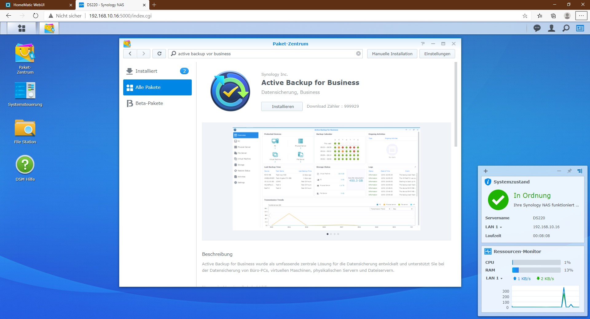 Begonnen habe ich mit der Installation der "Active Backup for Business"-Anwendung. Wie alle Anwendungen ist auch diese im Paket-Zentrum einfach zu finden und sehr schnell installiert. Zudem habe ich auch gleich noch den "Synology Virtual Machine Manager" mit ausgewählt.