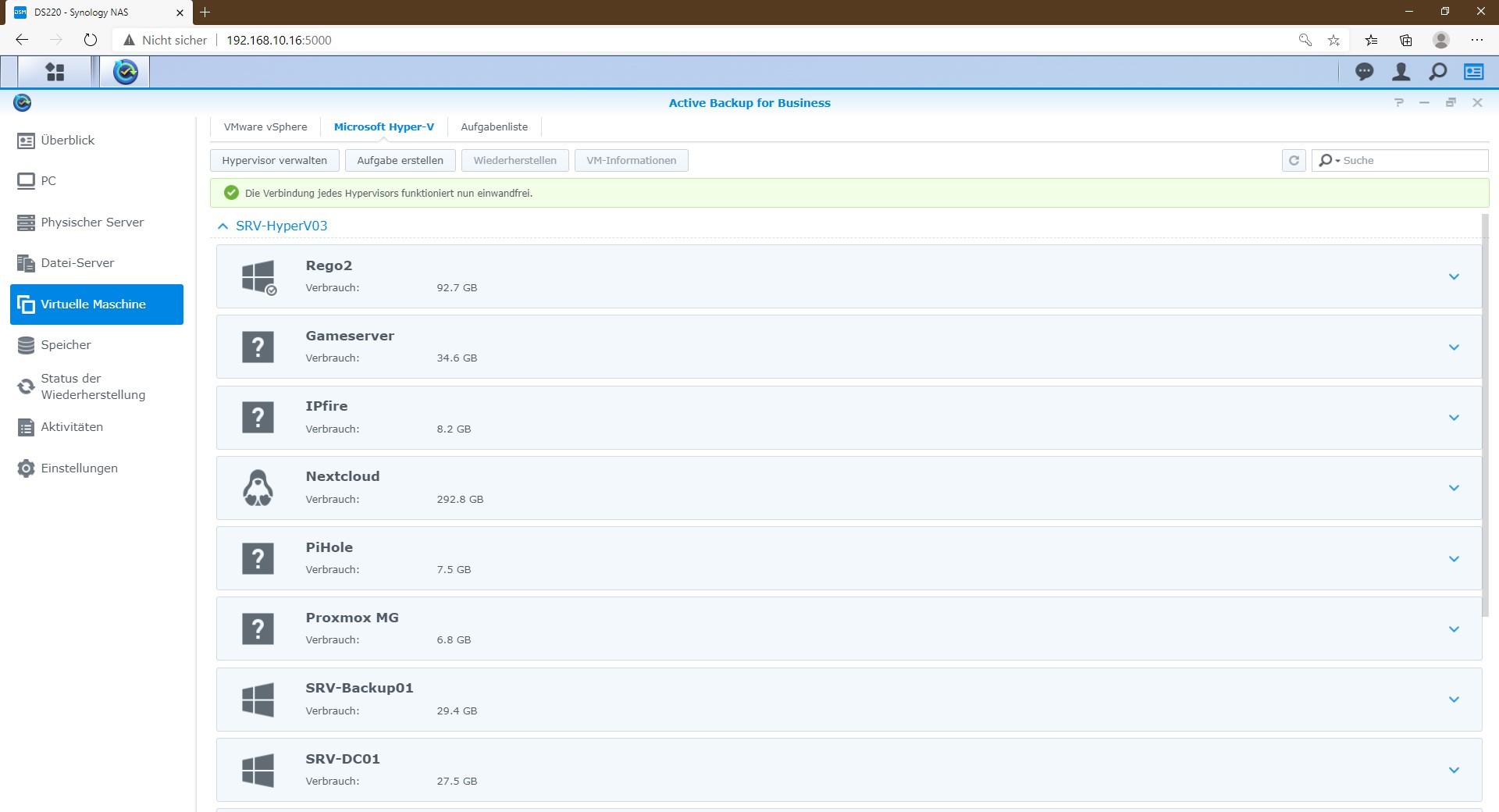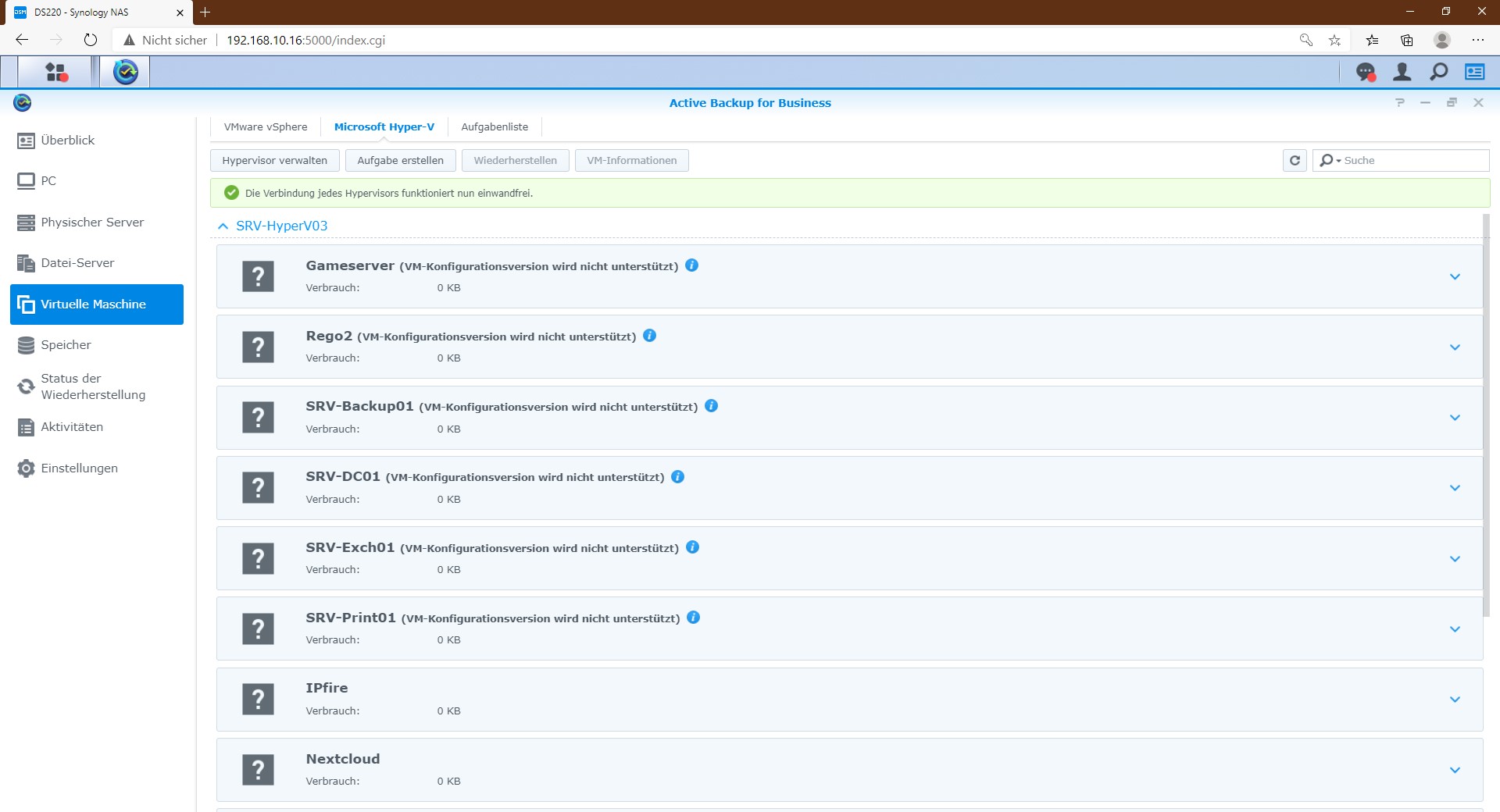 Beim Start von Active Backup wird im linken Bereich eine einfache Funktionsübersicht geboten. Im Bereich der "Virtuelle Maschine" wurde als erstes ein "Microsoft Hyper-V" Hypervisor hinzugefügt. Nach Anmeldung und Aktualisierung des Virtualisierungshostservers wurden die verfügbaren VMs angezeigt. Bei einigen erschien die Meldung "VM-Konfigurationsversion wird nicht unterstützt". Diese virtuellen Maschinen hatten noch eine Hardwareversion <6.2 und mussten zuerst auf eine aktuellere Version upgegradet werden. Direkt nach der Aktualisierung werden auch weitere Informationen über die VMs angezeigt.