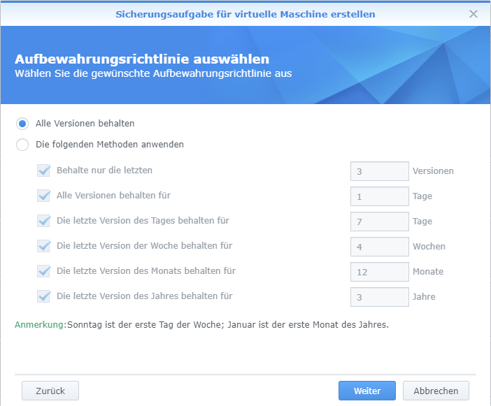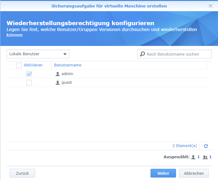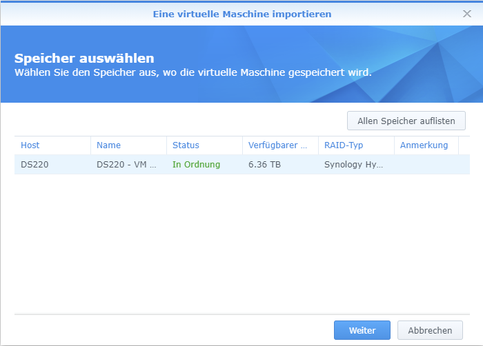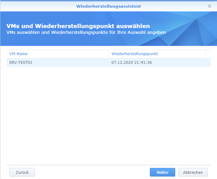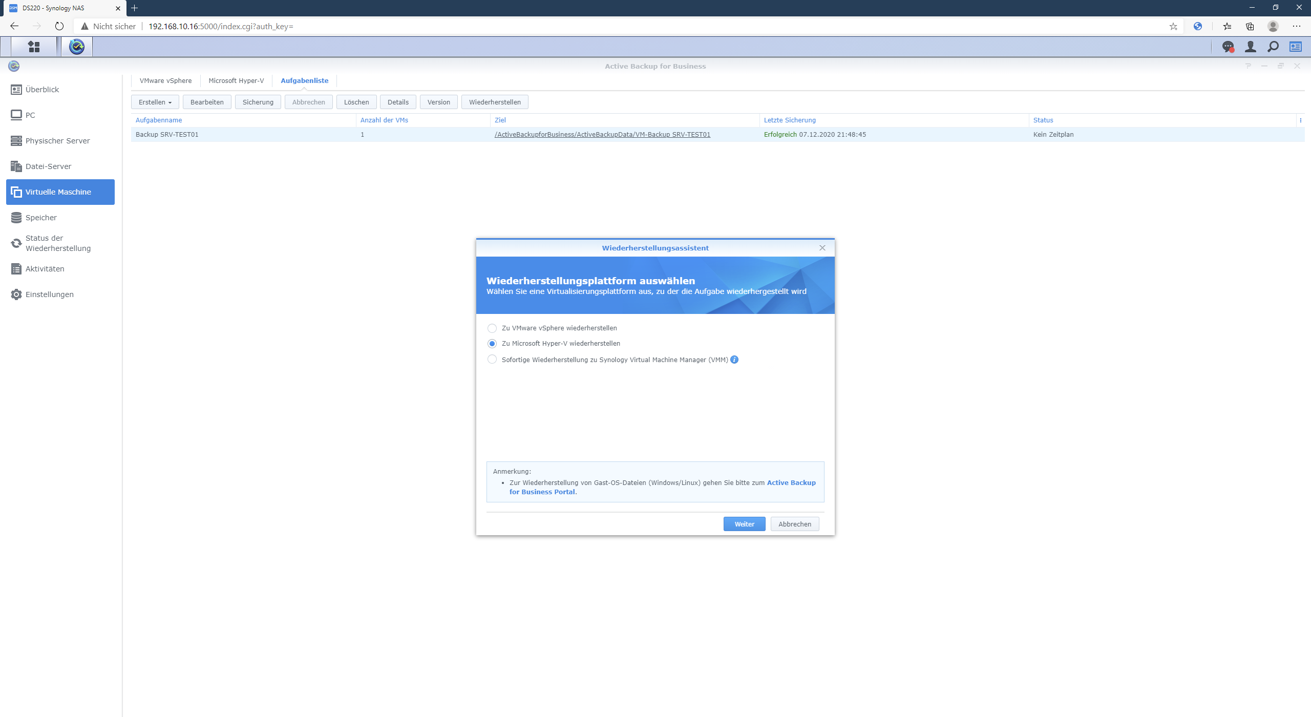 - sofortige Wiederherstellung zu Synology Virtual Machine Manager