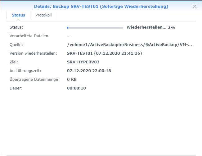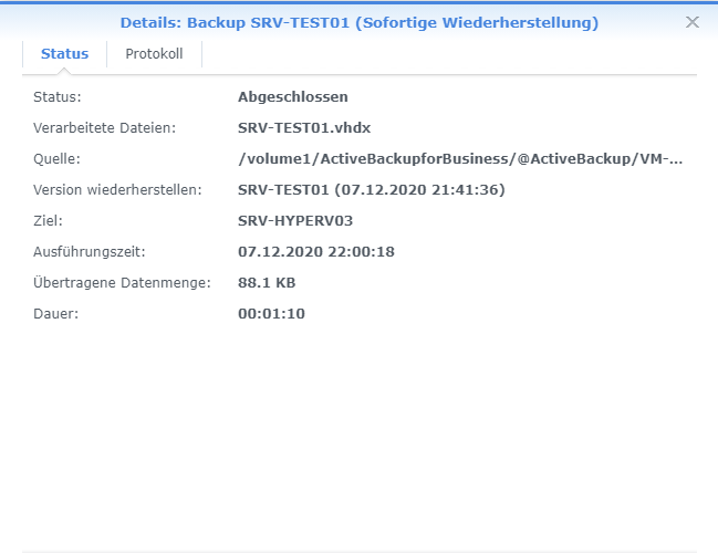 Die Sofortwiederherstellung ist ein sehr gutes Feature um Downtimes von VMs zu minimieren. Hierzu kann die virtuelle Maschine direkt auf der Synology NAS oder auf dem ursprünglichen Hypervisor ausgeführt werden. Als Speichersystem für die virtuellen Festplatten der VM dient aber weiterhin der Backupspeicher des NAS. Das virtuelle System kann somit umgehend gestartet werden, ohne dass zuerst die Daten der virtuellen Festplatten auf den Hypervisor wiederhergestellt werden müssen.