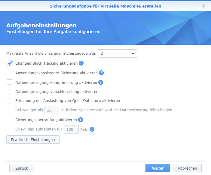 Es ist möglich, bei der Sicherung ein Zeitfenster vorzugeben. Das bedeutet, dass nur in diesem Zeitraum das Backup läuft. Kann die Sicherung nicht fertig gestellt werden, wird das Backup pausiert und im nächsten Zeitraum fortgesetzt.