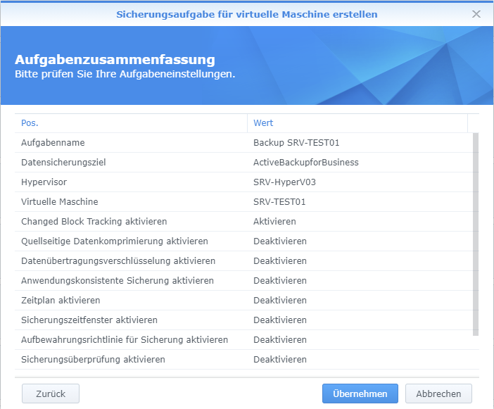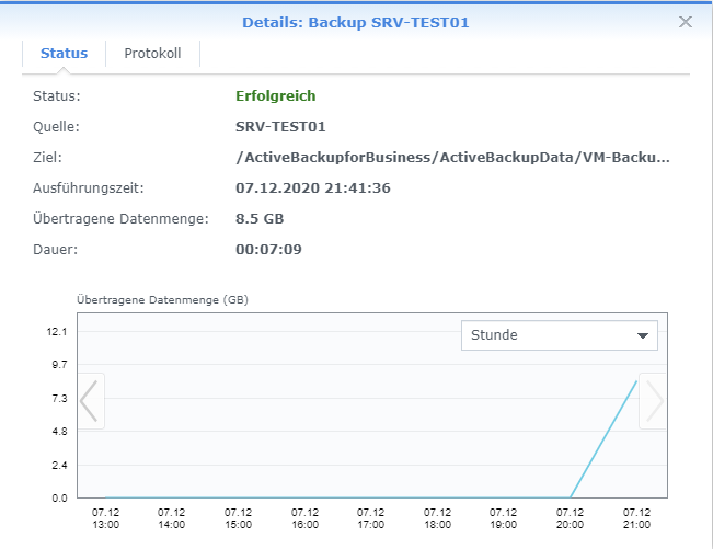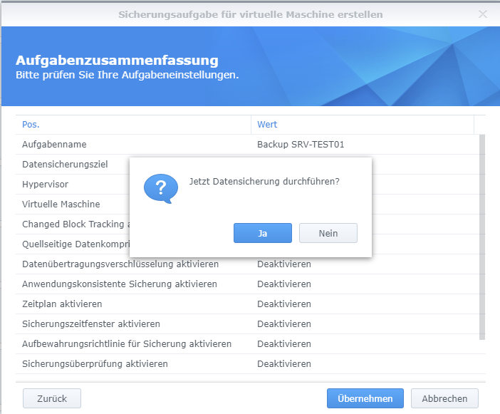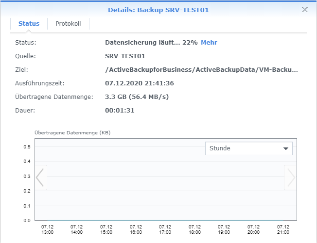 Über den Menüpunkt "Aufgabe erstellen" kann ein Sicherungsjob eingerichtet werden. Als erstes muss der Zielspeicher angegeben werden, gefolgt von den zu sichernden VMs, den gewünschten Optionen (ich habe hier den Standard belassen), gewünschter Zeitplan oder manuelle Sicherung, welche Versionen behalten werden sollen und abschließend, welche Benutzer Zugriff darauf haben sollen. Am Ende des Assistenten werden die gesetzten Optionen noch in der Aufgabenzusammenfassung angezeigt und beim Klick auf "Übernehmen" kann die Sicherung gestartet werden. In den Details kann man sich die laufende Sicherung ansehen.