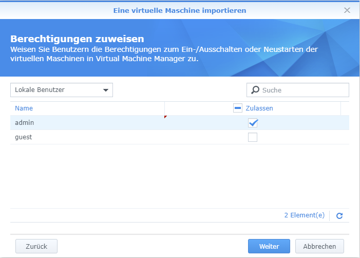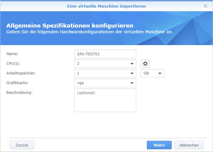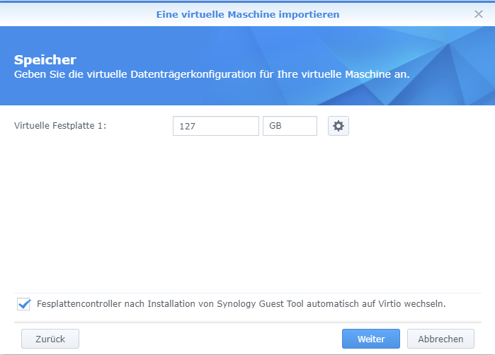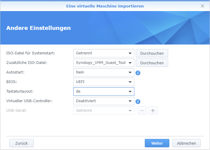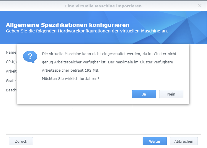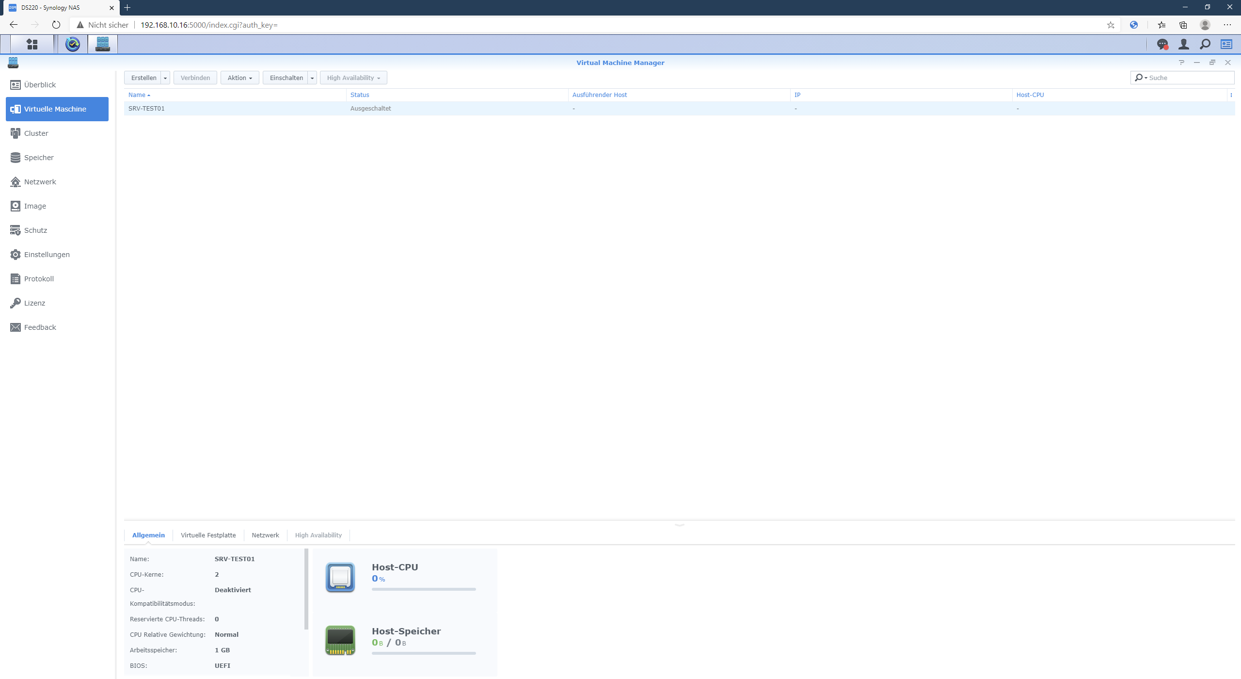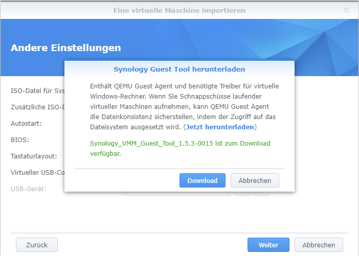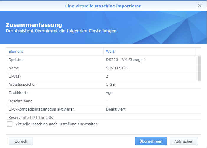 Die Wiederherstellung in den Synology VMM startet identisch zur vorherigen Wiederherstellung. Bei der Wiederherstellungsplattform wählen wir aber nun "Sofortige Wiederherstellung zu Synology Virtual Machine Manager (VVM)" aus. Als nächstes wird die betreffende VM und der Zielspeicher für die Wiederherstellung ausgewählt. Da es sich bei dieser Wiederherstellung um eine Änderung des Hypervisors handelt, müssen neue Spezifikationen (z.B. CPUs, RAM, Grafikkarte) für die virtuelle Maschine festgelegt werden. In diesem Fall bekomme ich eine Fehlermeldung, da die DS220+ nur mit 2 GB RAM ausgestattet ist und somit die VM nicht eingeschaltet werden kann - für den Test der Wiederherstellung ist dies aber nicht relevant. Die Fehlermeldung wird deshalb einfach bestätigt und als nächstes kann die Größe der virtuellen Festplatte geändert werden. Im folgenden Fenster können Details zum Netzwerk konfiguriert werden. Beim Wechsel zum nächsten Schritt, wird angezeigt, dass die erforderlichen "Synology Guest Tools" noch nicht vorhanden sind und jetzt heruntergeladen werden müssen. Nach wenigen Sekunden können die weiteren Einstellungen wie z.B. das Tastaturlayout gesetzt werden. Abschließend können die Berechtigungen zugewiesen werden und eine Zusammenfassung wird angezeigt.