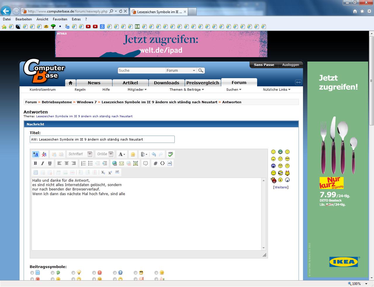 Nachdem mein PC mit windows7 versehen wurde, wechseln die Lesezeichen Symbole im Internet Explorer 9 vom eigentlichen, vergebenen Symbol
