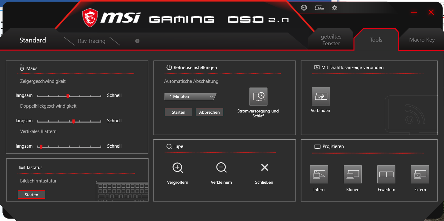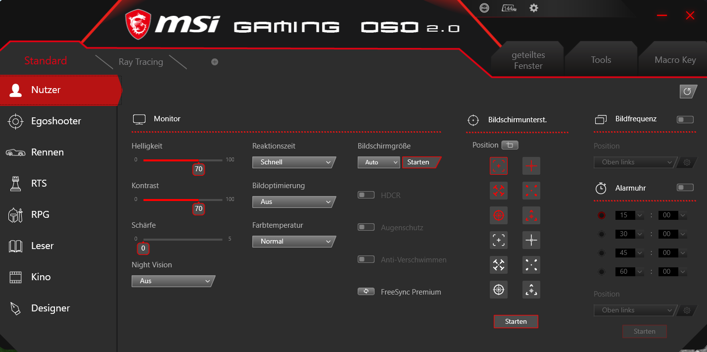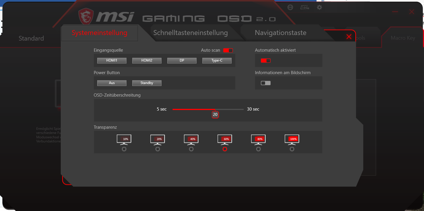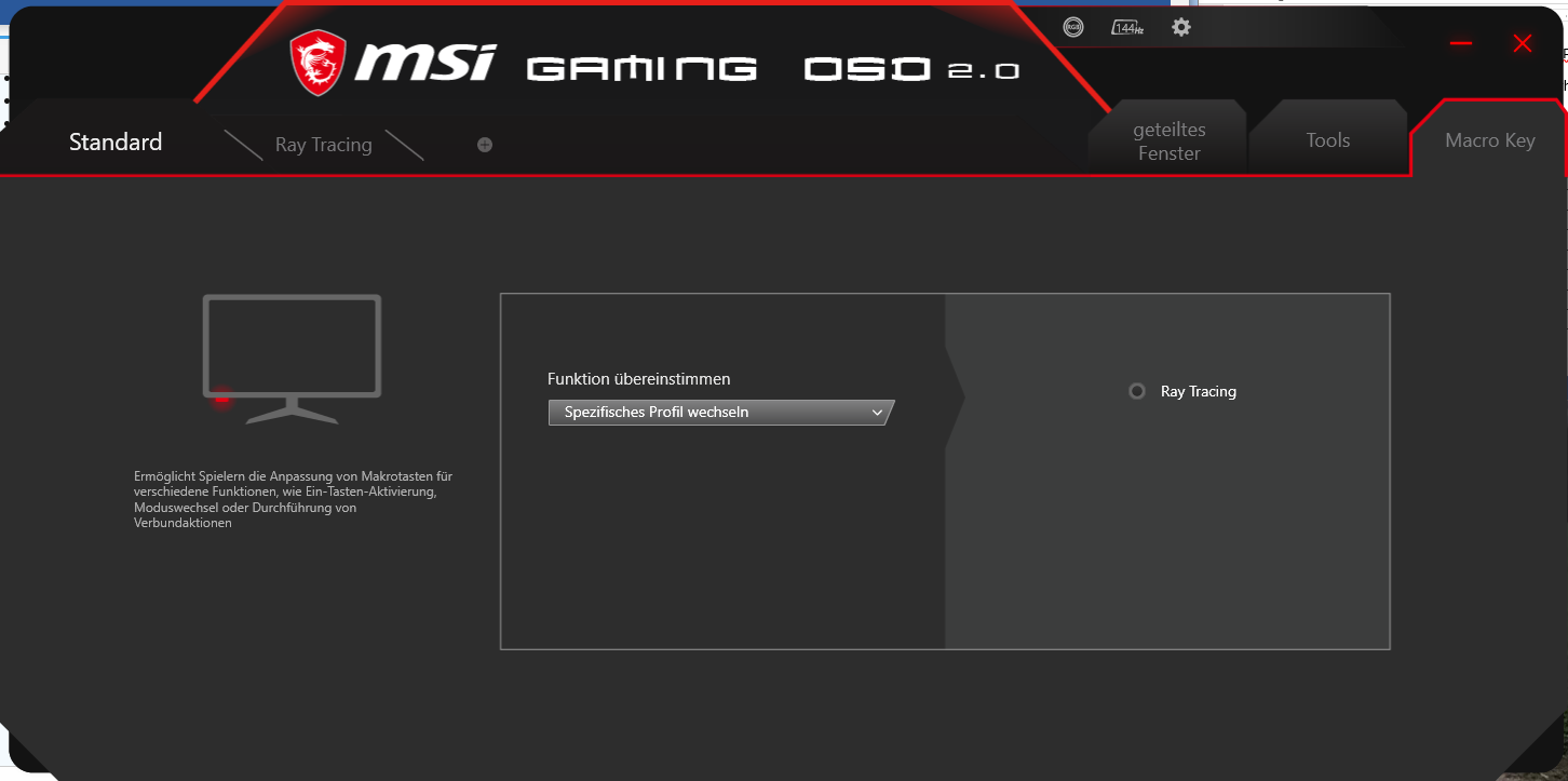 Des Weiteren gibt es links unten am Monitor noch einen „Macro Key“ auf dem man weitere Aktionen per Tastendruck ausführen kann. Damit kann man die 3 Hardwareprofiltasten am Fuß meines BenQ Monitors gut kompensieren. Durch das deutlich schnellere OSD lässt sich der MSI Monitor besser bedienen als mein BenQ.