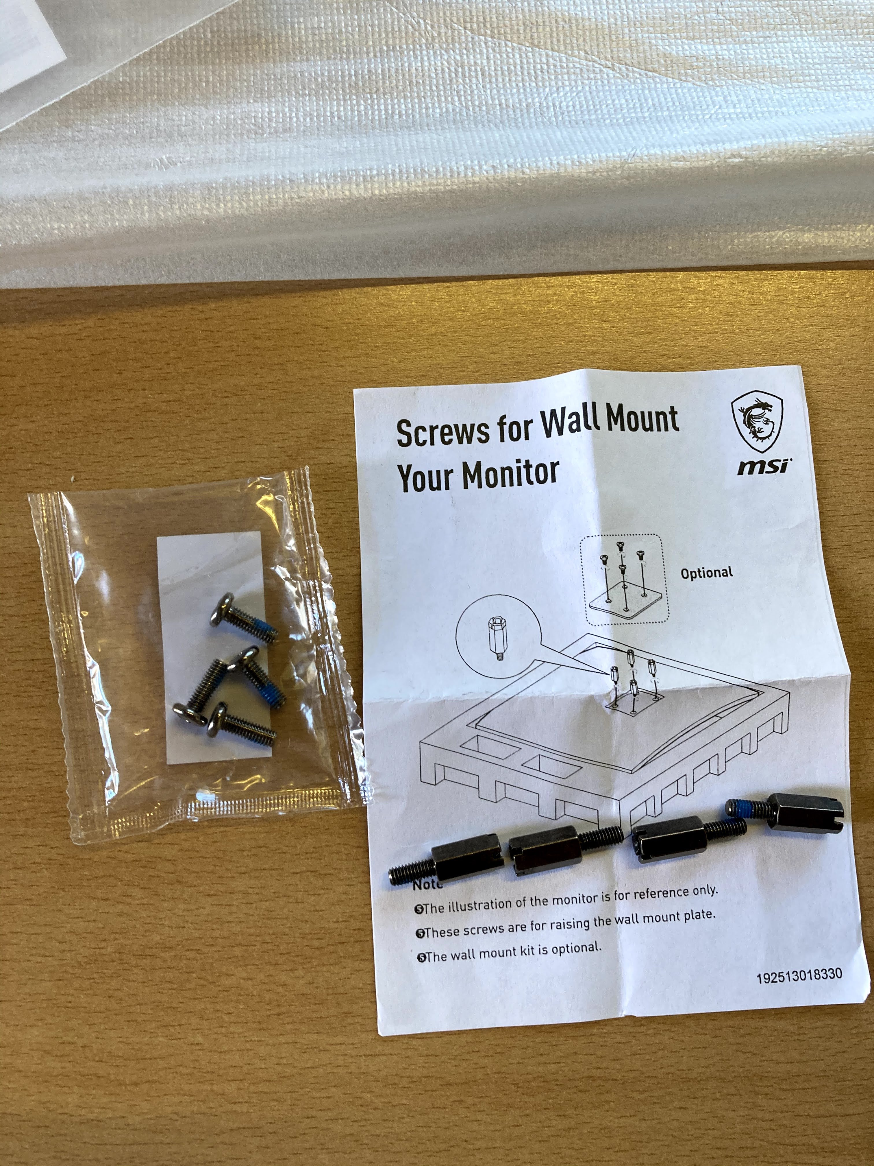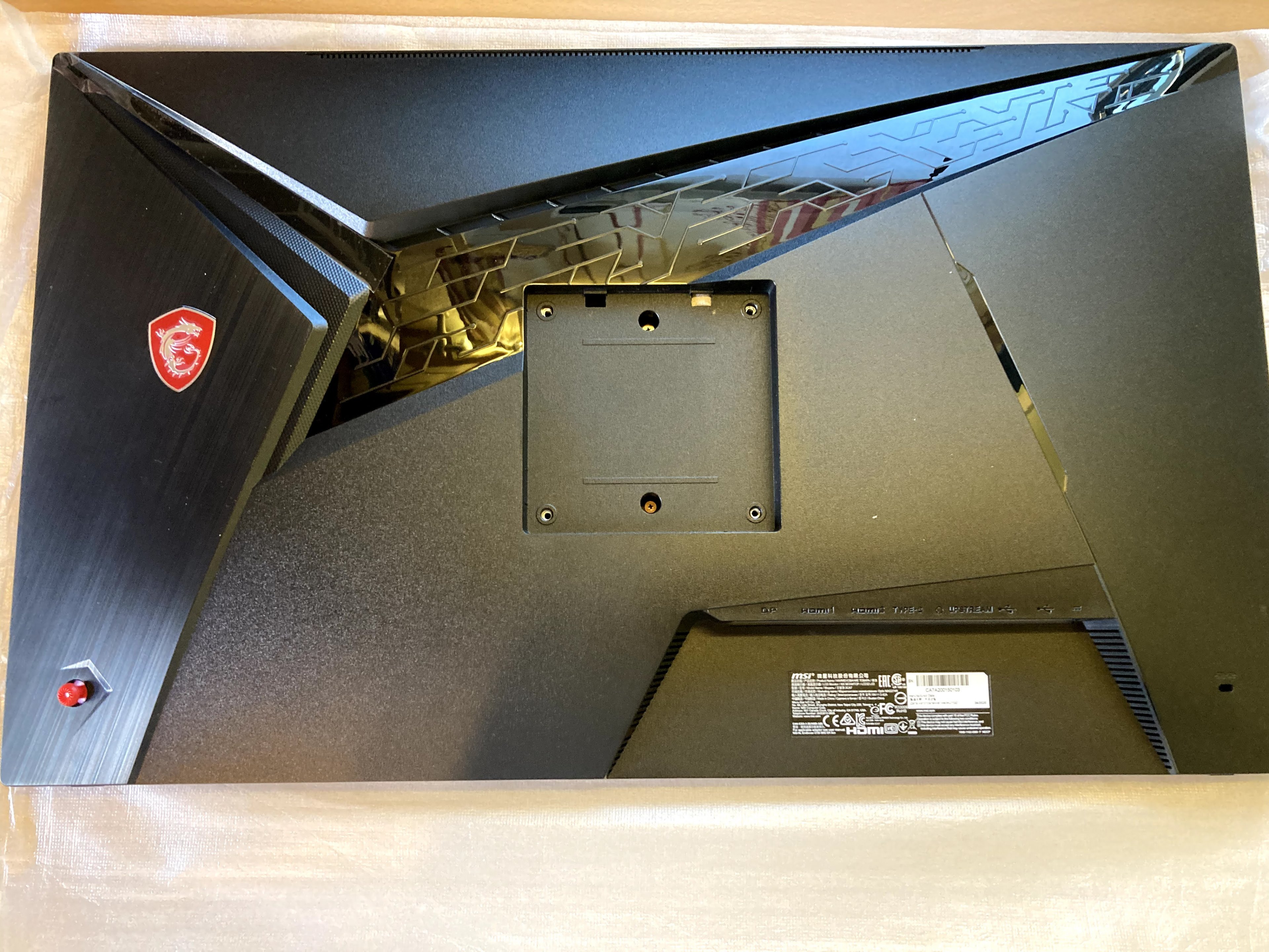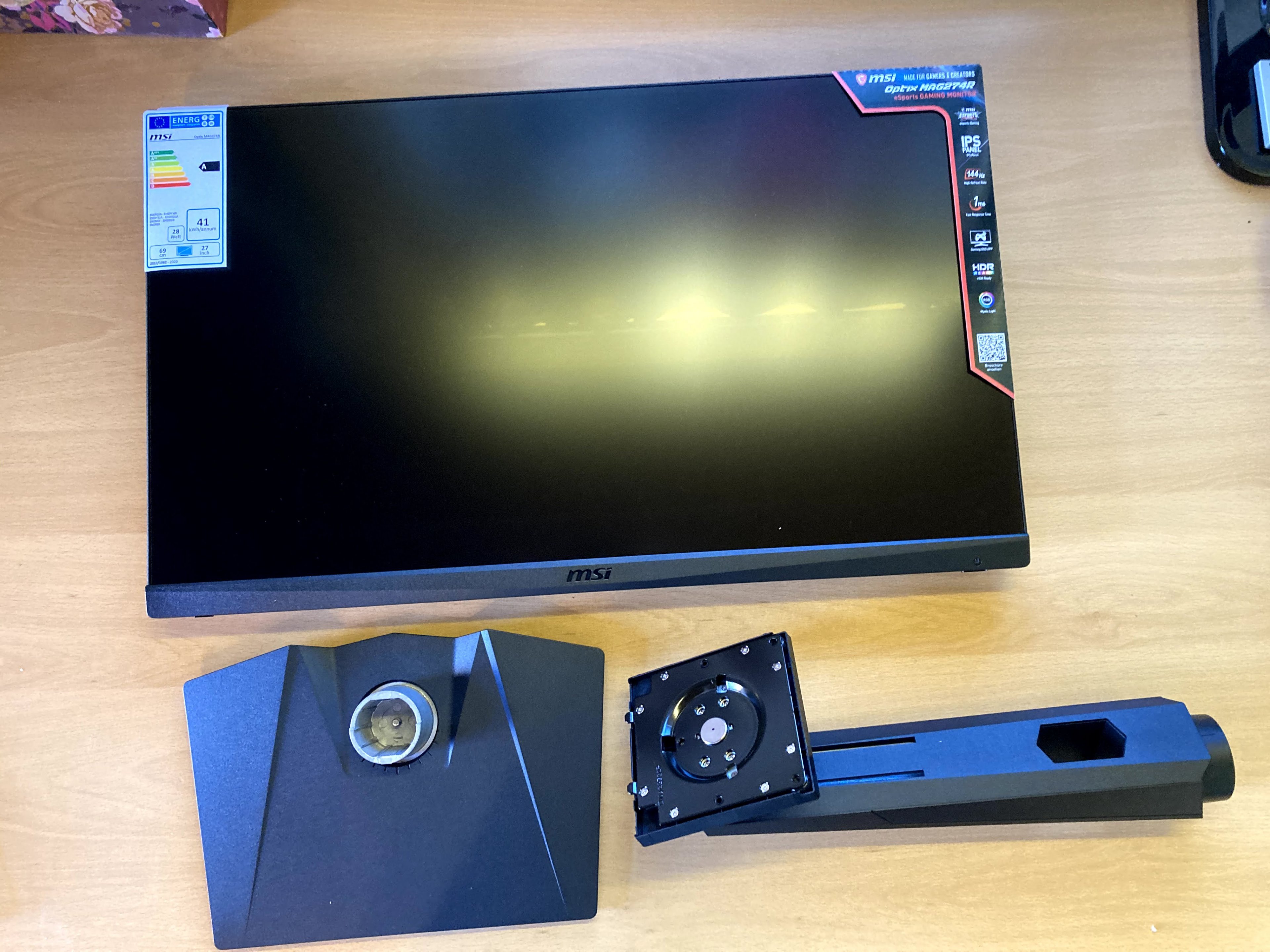 Der Aufbau gestaltet sich relativ unkompliziert. Im Standfuß ist eine Schraube fest eingelassen mit der die Standfußsäule festgeschraubt wird. Die Standfußsäule wird in den Monitor gehangen und mit 2 Schrauben fixiert. Hier kommt gleich der erste Kritikpunkt. Bei meinem BenQ Monitor wird der Monitor auch in den Fuß gehangen, die Arretierung wird aber durch einen Knopf gewährleistet, welcher einrastet. Dadurch ist die Demontage immer Werkzeuglos möglich, dies ist beim MSI leider nicht der Fall.