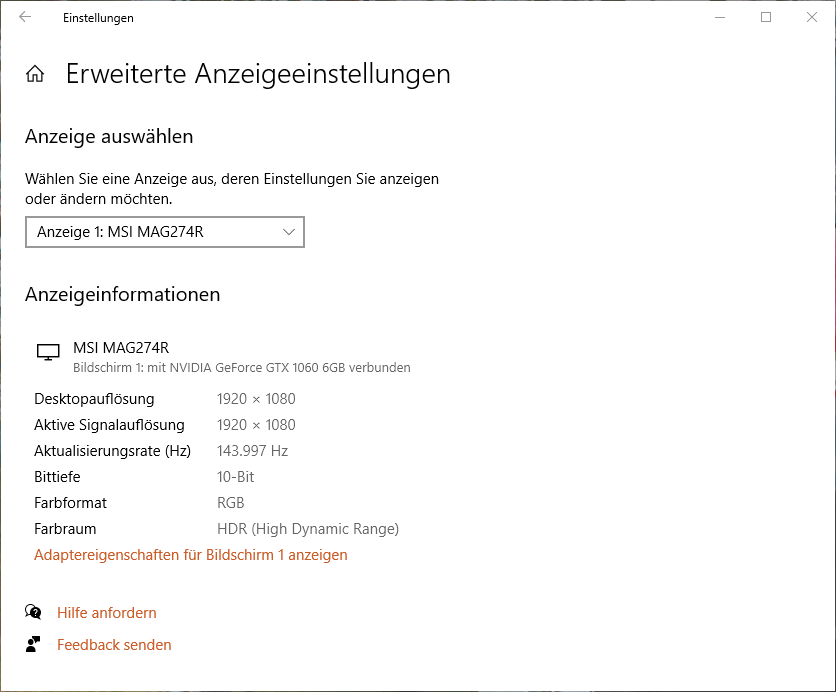 MSI auf 144 Hz eingestellt. Windows zeigt an 143,997 Hz