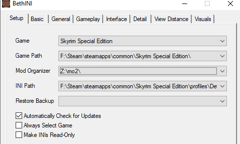Und vorweg: Beachte, dass wenn das Spiel über MO2 gestartet wird, sämtliche INI Änderungen im Skyrim Launcher oder in der INI selbst per Editor, unwirksam sind (es sei denn du gehst über MO2 in die INIs). Weil dann auf die "MO2 INIs" von MO2 zugegriffen wird, welche unabhängig von den original INIs sind. Auch wenn BethINI verwendet wird, müssen die Zugriffpfade geändert werden. Macht man das nicht, sind die Änderungen nur aktiv, wenn das Spiel ohne MO2 gestartet wird, wodurch die über MO2 installierten Mods dann aber nicht geladen werden.