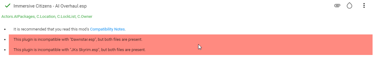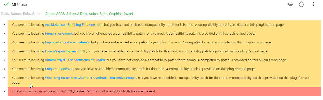 Dann lies dir die Nachrichten mal durch und versuch es zu lösen. Lese auch die komplette Mod Description der Seiten zu den betroffenen Mods durch, achte auf weitere Downloads und die Installations-Reihenfolge. Enhanced Landscapes und 3D Trees ist i.O., wenn Enhanced Landsacpes vor 3D Trees geladen wird. Immersive Citizens und Danwstar ist keine schwerwiegende Sache, kann man lassen. Note: Nach dem Mergen von vorwiegend Compatibility Patches, kommt ein Großteil der Meldungen wieder. Wenn du nicht genau weißt, was gemacht wurde: Gute Nacht. Was du nicht gelöst kriegst kannst du hier erfragen. Das ist der Grund warum Neulinge nicht den kompletten Guide, sondern Vanilla Skyrim HD installieren sollen. Dazu kannst du ja BethINI installieren und die Verdant.ini aufbohren und zusätzlich noch im Spiel mit Shift + Enter im ENB Menü ein paar Dinge auf max. Quality setzen. Reicht das nicht: Die meisten Textur Mods sind einfacher zu installieren und haben kein Plugin. Wenn dazu noch TES5LODGen, Dyndolod und Bashed Patch kommen, hast du schon ein richtiges "knaller skyrim" mit einem Bruchteil des Aufwands.