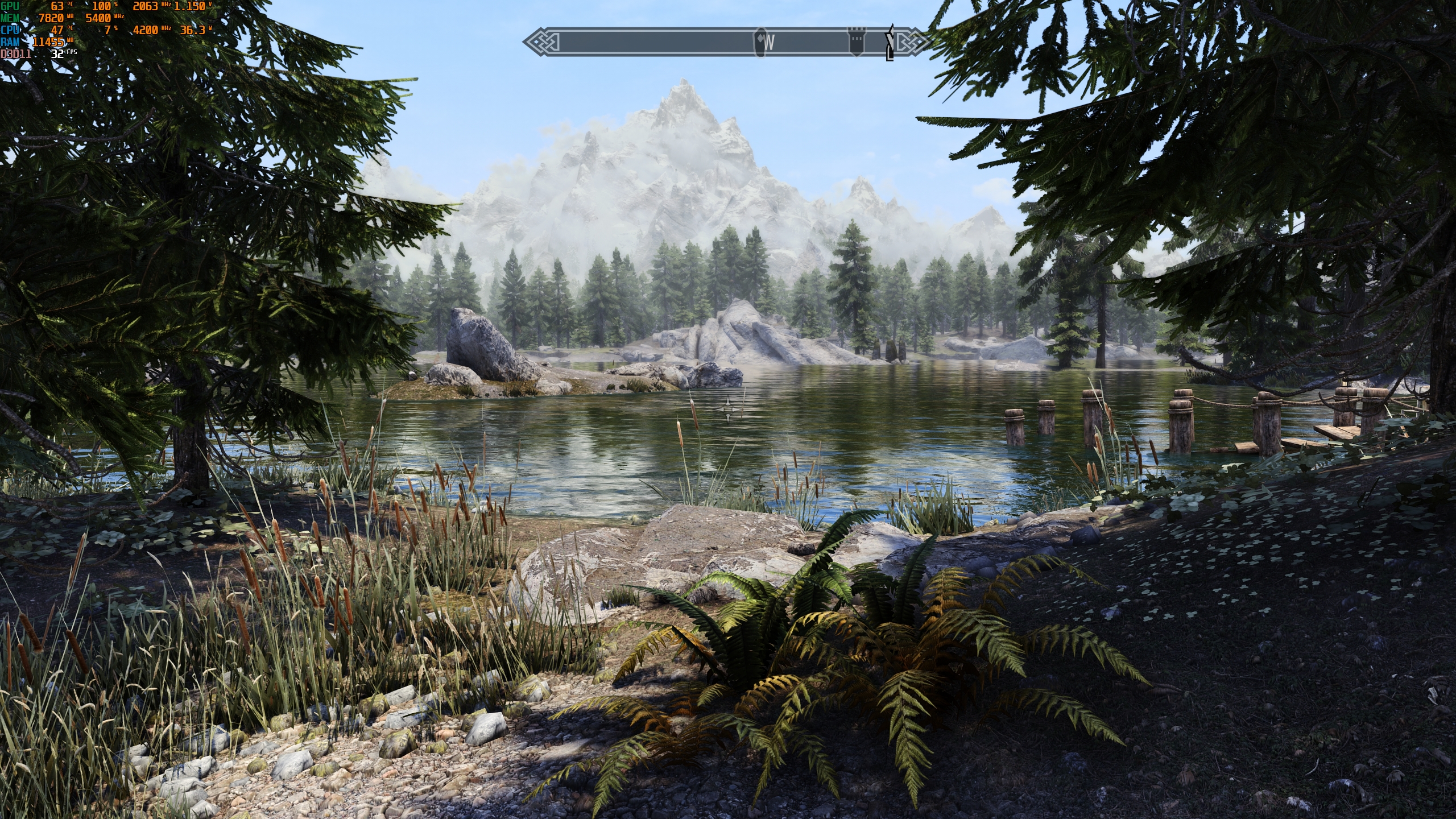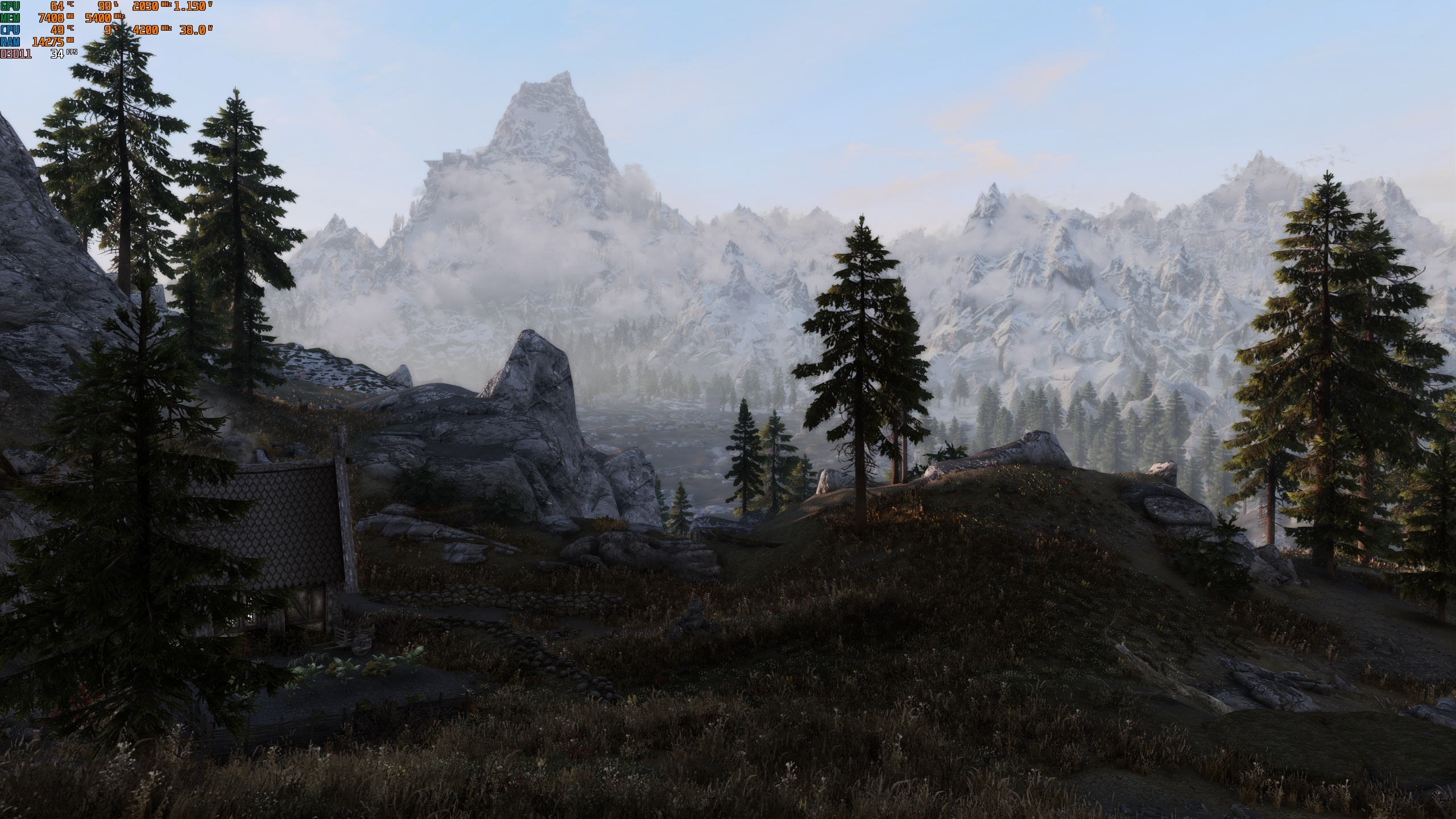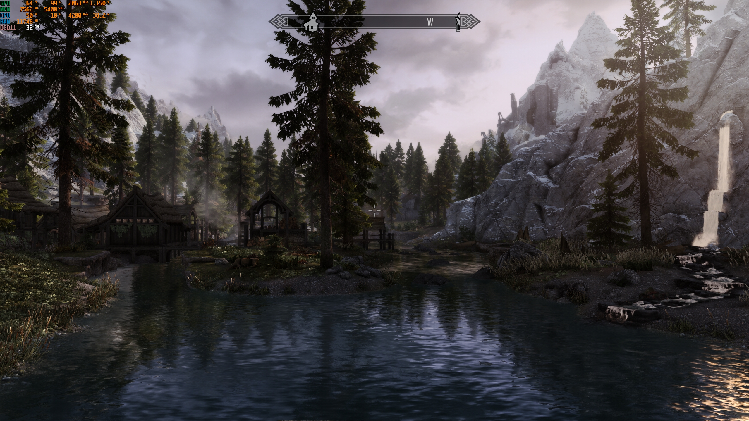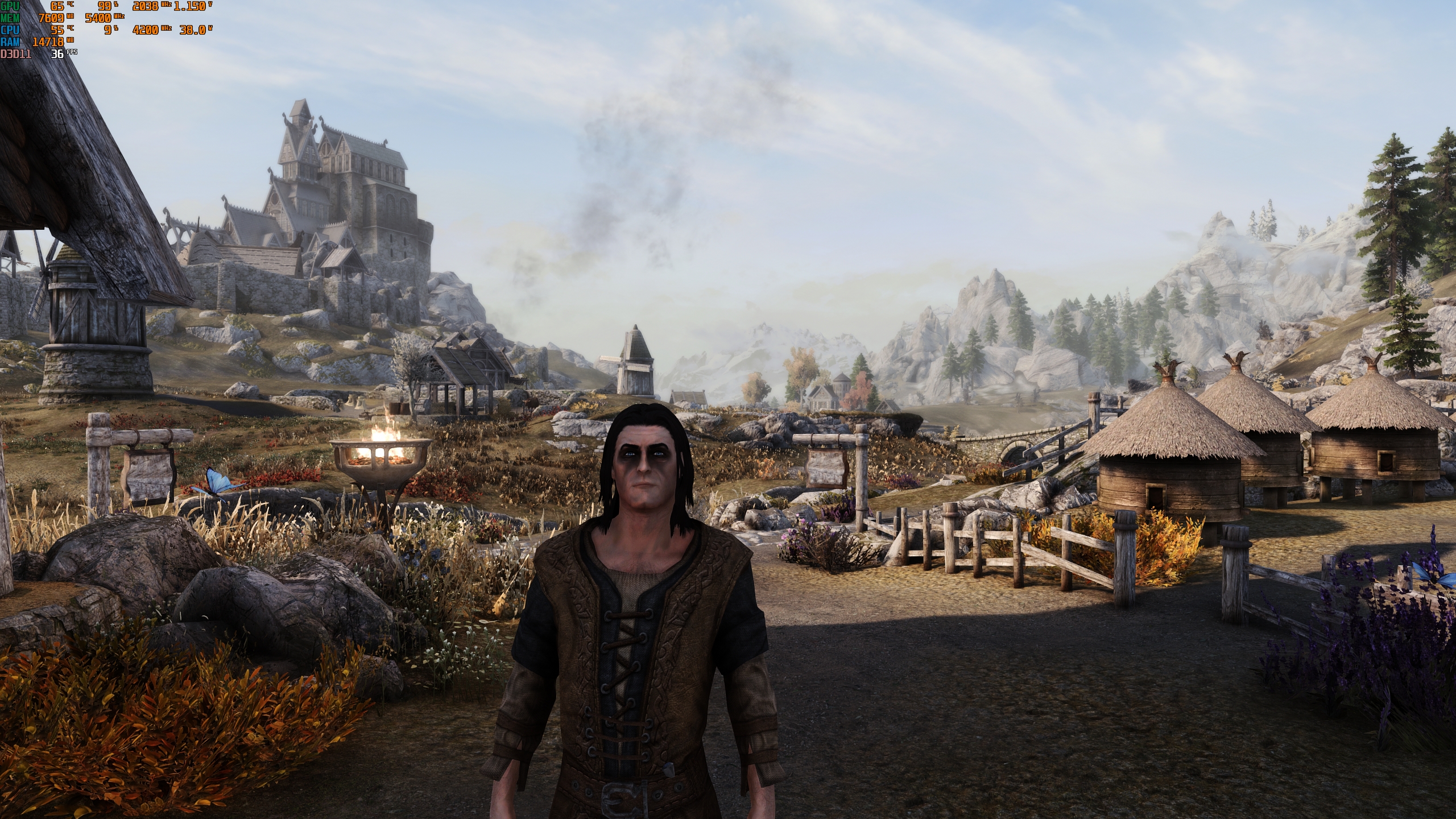WQHD, BethINI High + BethINI Recommended Tweaks, Veydosebrom Vanilla Landscape + Sparse INI Setting (default geht nicht wegen den FPS), NVT ENB (Full Quality Ordner) für Cathedral Weathers, mit zusätzlich aktivierten ENB Effekten, aber auf Medium Qualität (und nicht High oder Ultra). Mit den wundervollen HD LODs. Das Ganze sähe mit Ultra+ INIs sicher nochmal besser aus, aber naja, mehr geht halt nicht.